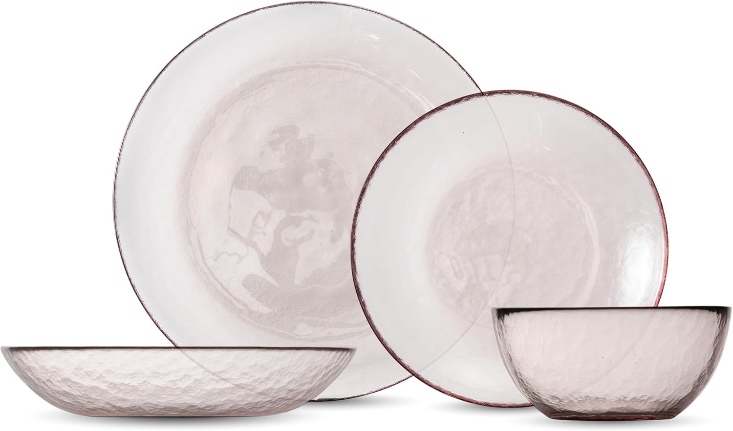 FORTESSA Los Cabos Tableware, 16-Piece Glass Dinnerware Set with 4 Dinner Plates, 4 Salad Plates, 4 Coupe Bowls and 4 Cereal Bowls, Dishwasher-Safe Glass Plate Set, Pink