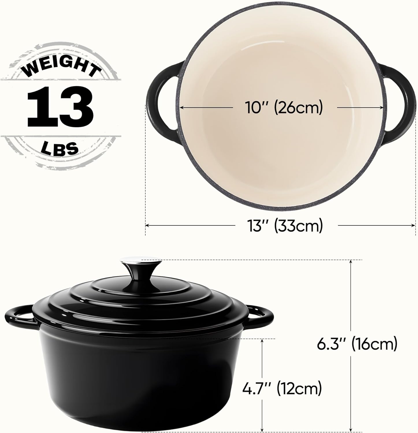 6 Quart Dutch Oven Pot with Lid, Non Stick Enameled Cast Iron Dutch Oven for Bread Baking, Heavy-Duty, Oven Safe Ceramic Cookware Up to 500°F for Baking, Braising, Stews, Roasting, Black