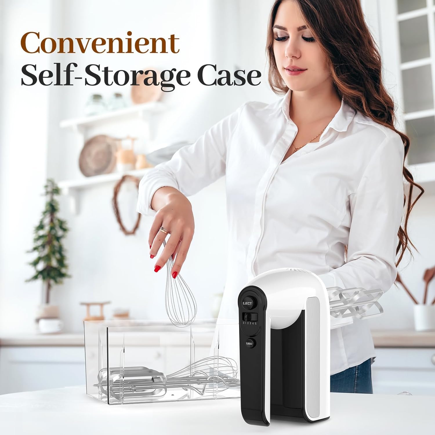 5-Speed Electric Hand Mixer, 800W Handheld Mixer with Turbo for Baking & Cooking, Kitchen Food Mixer with Storage Case & 5 Stainless Steel Attachments (2 Beaters, 2 Dough Hooks, 2 Whisks)-White