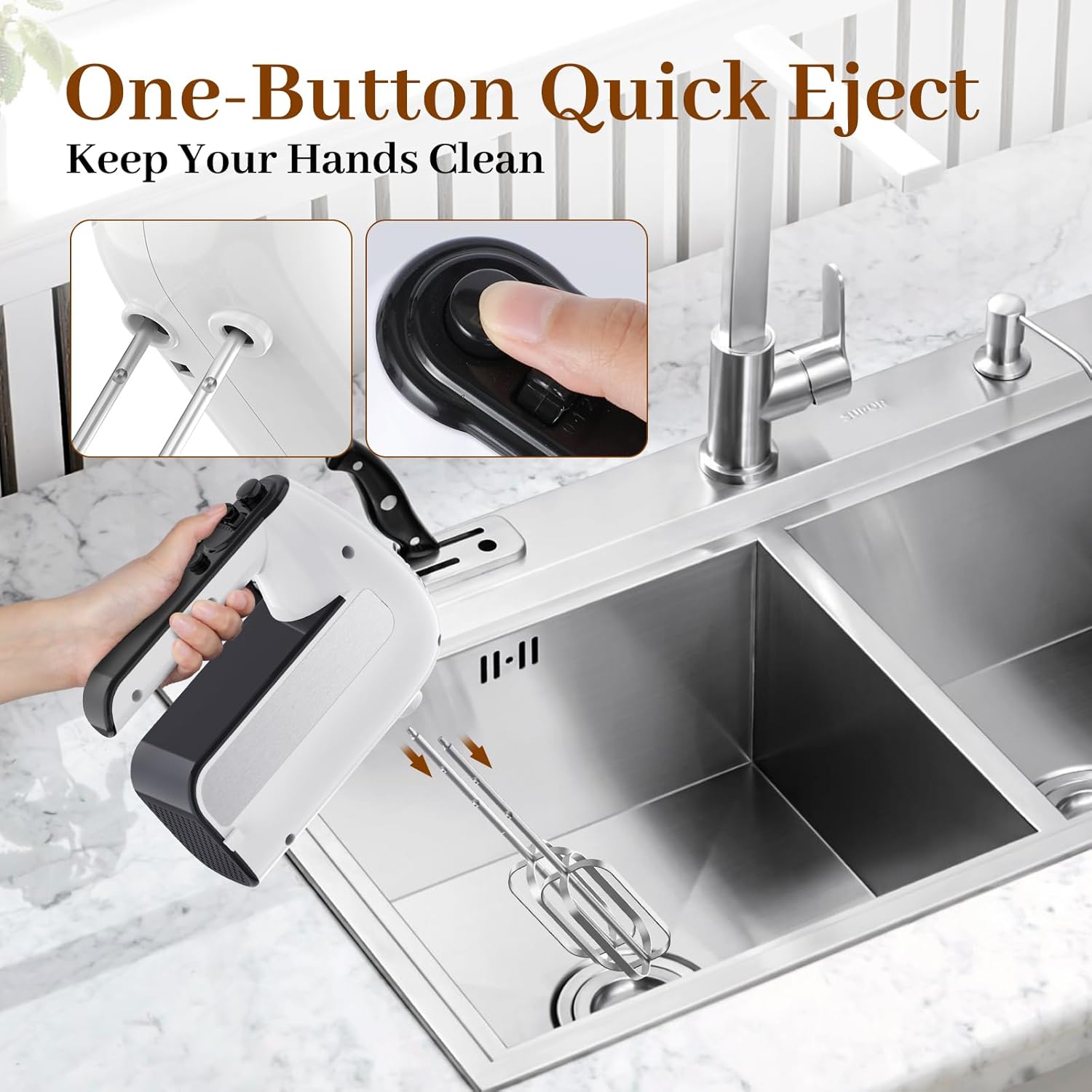 • 【𝐄𝐚𝐬𝐢𝐥𝐲 𝐑𝐞𝐥𝐞𝐚𝐬𝐞 𝐀𝐜𝐜𝐞𝐬𝐬𝐨𝐫𝐢𝐞𝐬】The electric hand mixer comes with 2 traditional beaters, 2 dough hooks and 2 whisks, The eject button can quickly remove any of the included accessories from the hand mixer with the single-handed press of the button and keep your hands clean