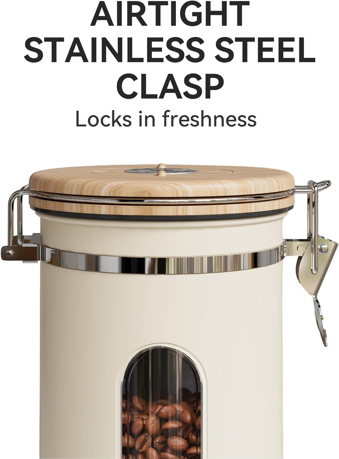 • Date Tracker, Window, & Free Scoop:Keep your coffee fresh by setting storage or expiry dates with our date tracker on the lid. A handy window lets you see how many beans are left without opening the canister; Plus, we provide a free stainless steel coffee scoop that attaches with a hook