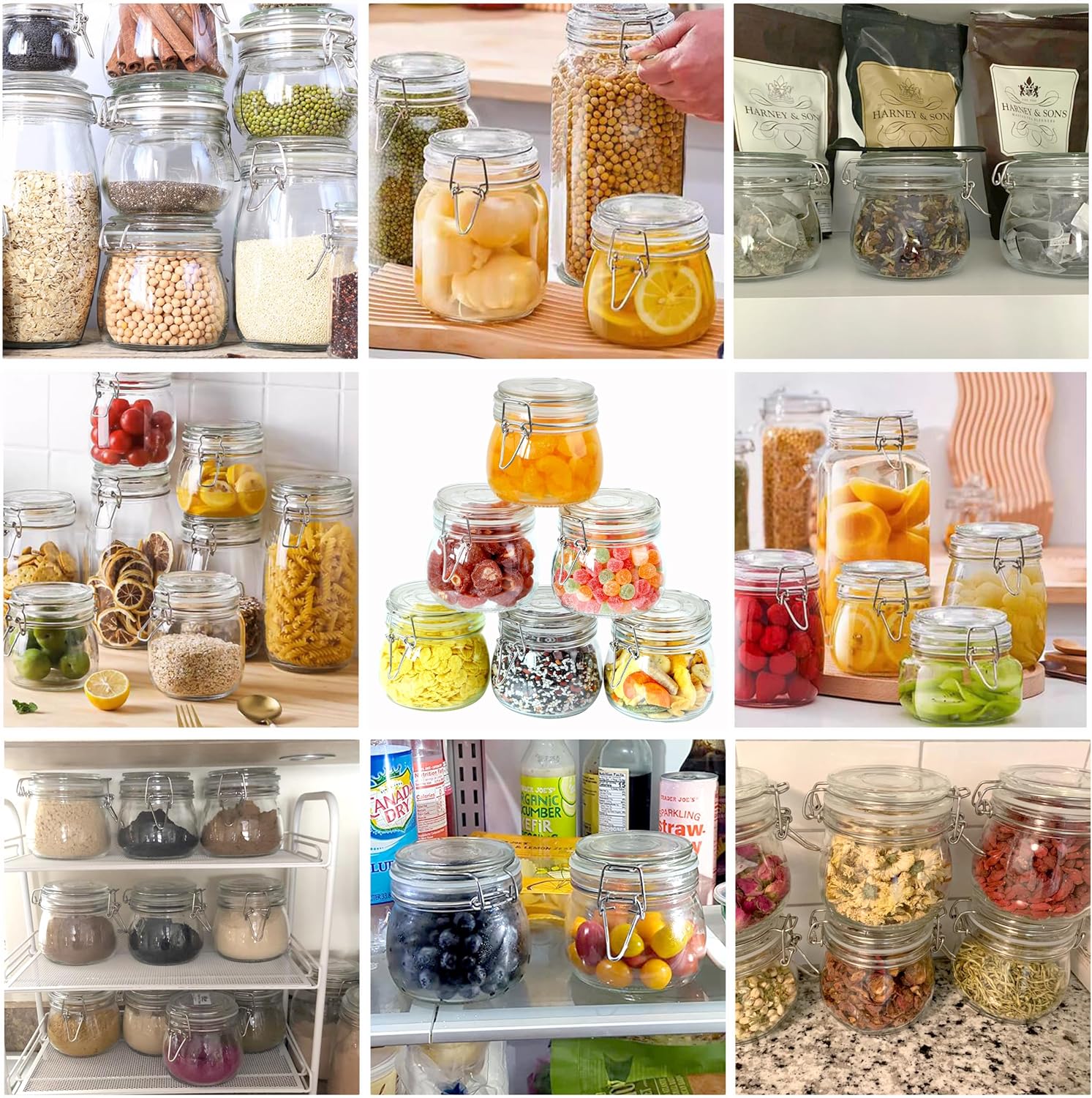 • AIRTIGHT & LEAKPROOF FOOD STORAGE JAR : The lids of the glass food container are airtight design, with food grade silicone seal gasket, will ensure an airtight seal leak-proof, keep your food dry fresh and preserve the flavor of food for a long time.The stainless steel secure buckle is easy to open and close, will reduce the mess when using the airtight storage jar.