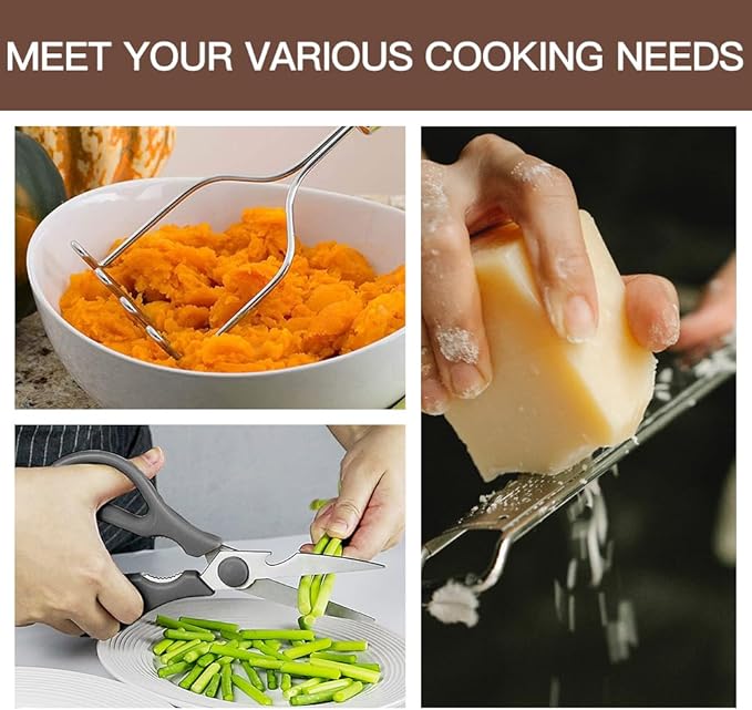• 32 COOKING UTENSILS - Utensil Set includes everything you need to cook that perfect dish,includes Turner,Slotted turner,Skimmer,Spoon,Ladle,Pasta server,Tongs,Whisk,Spatula spreader,Spoon spatula,Large and samll Measuring spoons,Holder,Brush,Spatula,Grater,Strainer,Scissors,Potato pusher,Can opener,Bottle opener,Pizza cutter,Ice-cream spoon