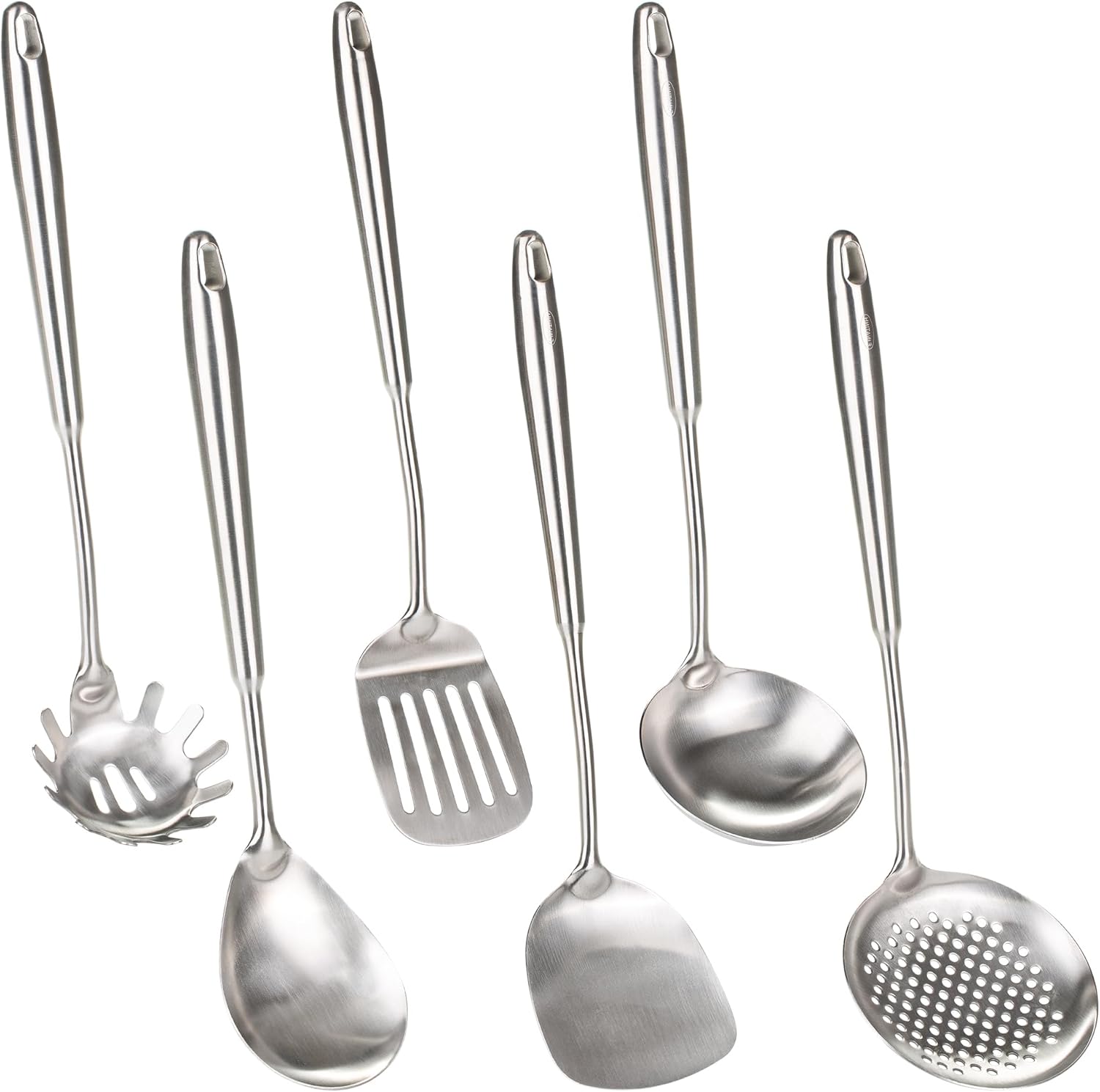 FJNATINH 6-Pieces 304 Stainless Steel Wok Spatula Set,Cooking Utensil Set,Soup Ladle Colander,Nonstick Kitchen Cooking Utensils Set with Spatula,Kitchenware Tools