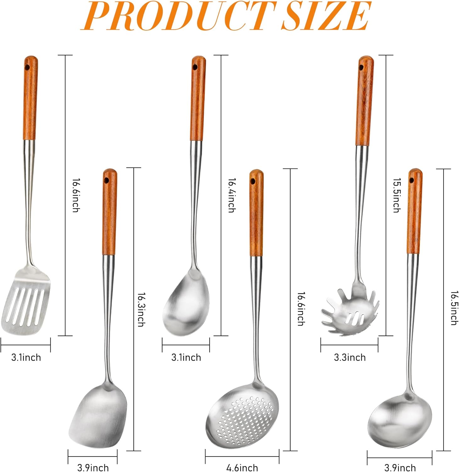 • Size of Wok Utensils Set:16-17 inches length,enough length ensures that we keep our hands away from the hot wok while making delicious meals with ease.Doesn't react with foods and ensure them delicious