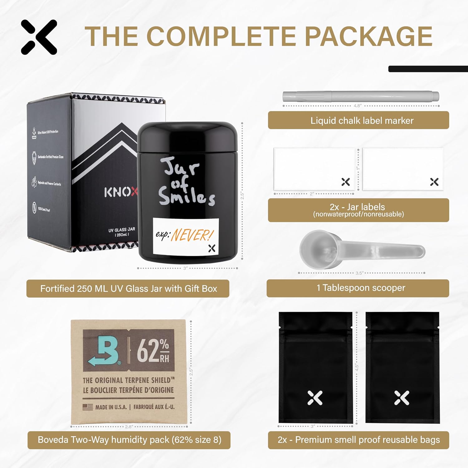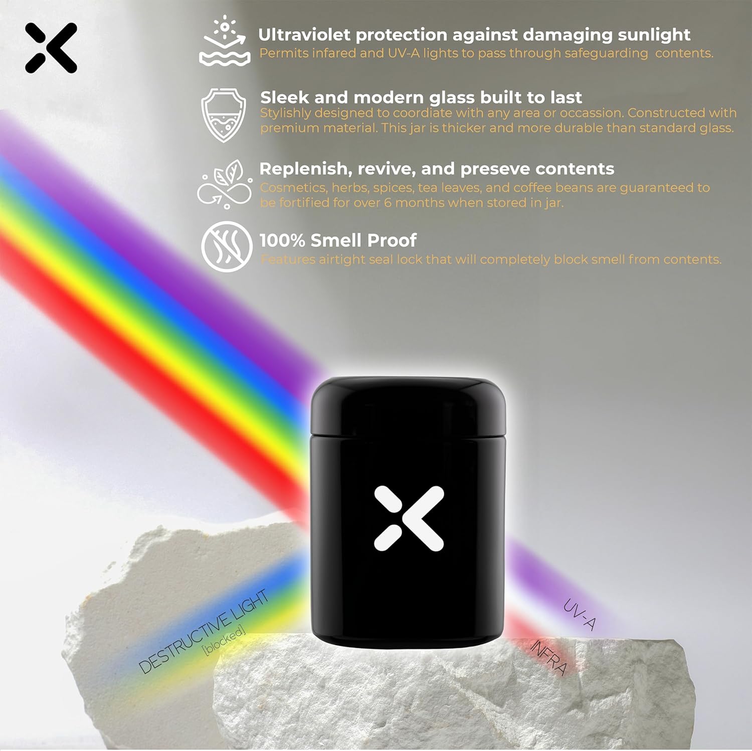 • 💨【100% SMELL PROOF & AIRTIGHT SEAL】 Fort Knox UV 250ml glass jar is meticulously engineered to preserve the freshness and potency of your herbs, spices, teas, coffee, cosmetics, lotion, and perishables. The airtight seal creates an impenetrable barrier, preventing any odors from escaping and maintaining the perfect environment inside. No more worries about unwanted scents lingering in your surroundings.
