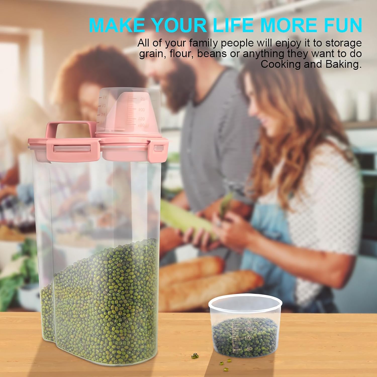 • PORTABLE POURING SPOUT with HAND GRIP: this small and convient container wich can storage around 2.5KG rice.It designed with ergonomic grip. Food can be poured directly out of the mouth. Reduce the steps to open the lid. The measuring cup can help you check how much food you get. Portable handle for you to take it go anywhere you want