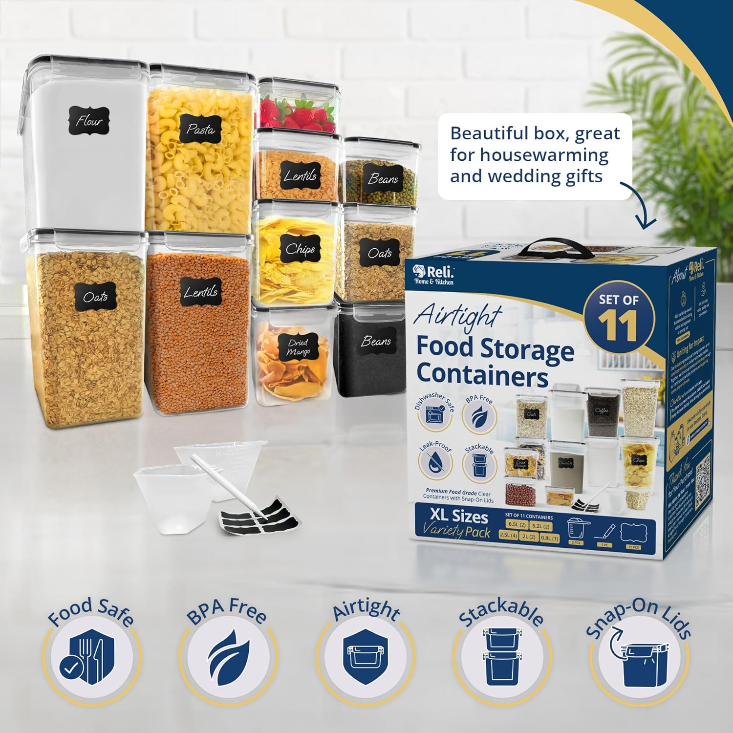 Reli. Airtight Food Storage Containers with Lids (11 Sets) | Kitchen Organizers and Storage Pantry Organizers | BPA Free Plastic Food Container XL Size Variety Pack w/ 2 Measuring Cups, 12 Labels, Pen
