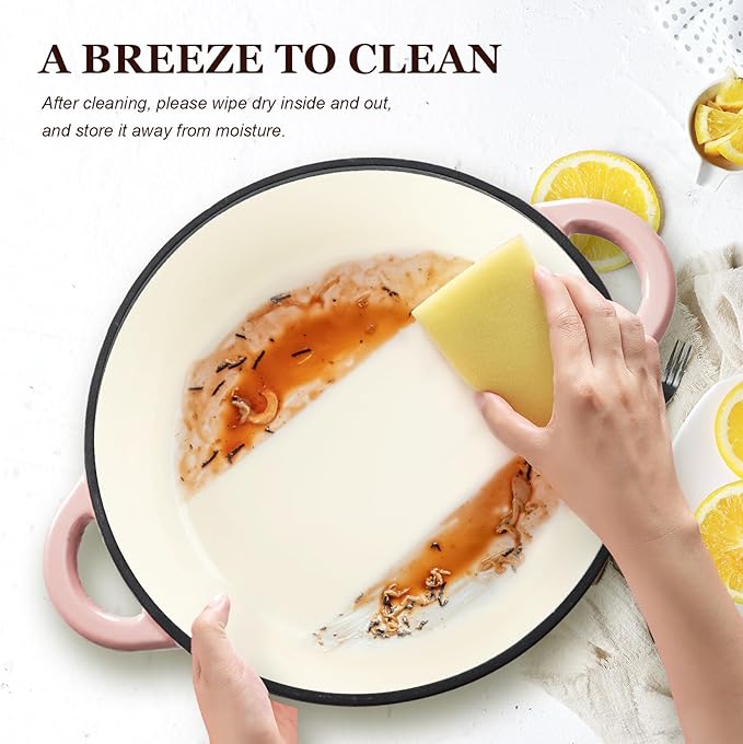 • Effortless Cleaning & Safety First: The flat and smooth enamel surface not only delivers a superior cooking experience but also makes cleaning a breeze. Easily remove food residues with a gentle wipe from a soft sponge or cloth. Additionally, we've included a cotton heat-resistant cap, ensuring a comfortable grip and safeguarding you from burns when handling the pot's handles and lid.