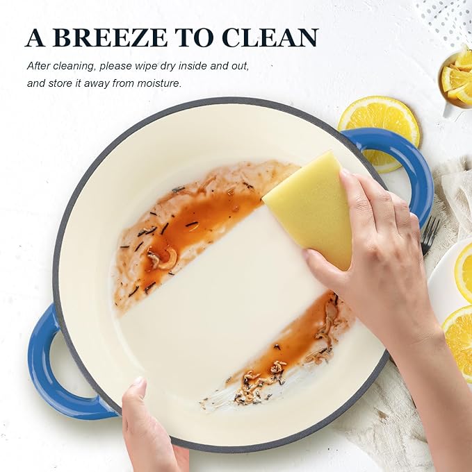 • Effortless Cleaning & Safety First: The flat and smooth enamel surface not only delivers a superior cooking experience but also makes cleaning a breeze. Easily remove food residues with a gentle wipe from a soft sponge or cloth. Additionally, we've included a cotton heat-resistant cap, ensuring a comfortable grip and safeguarding you from burns when handling the pot's handles and lid.