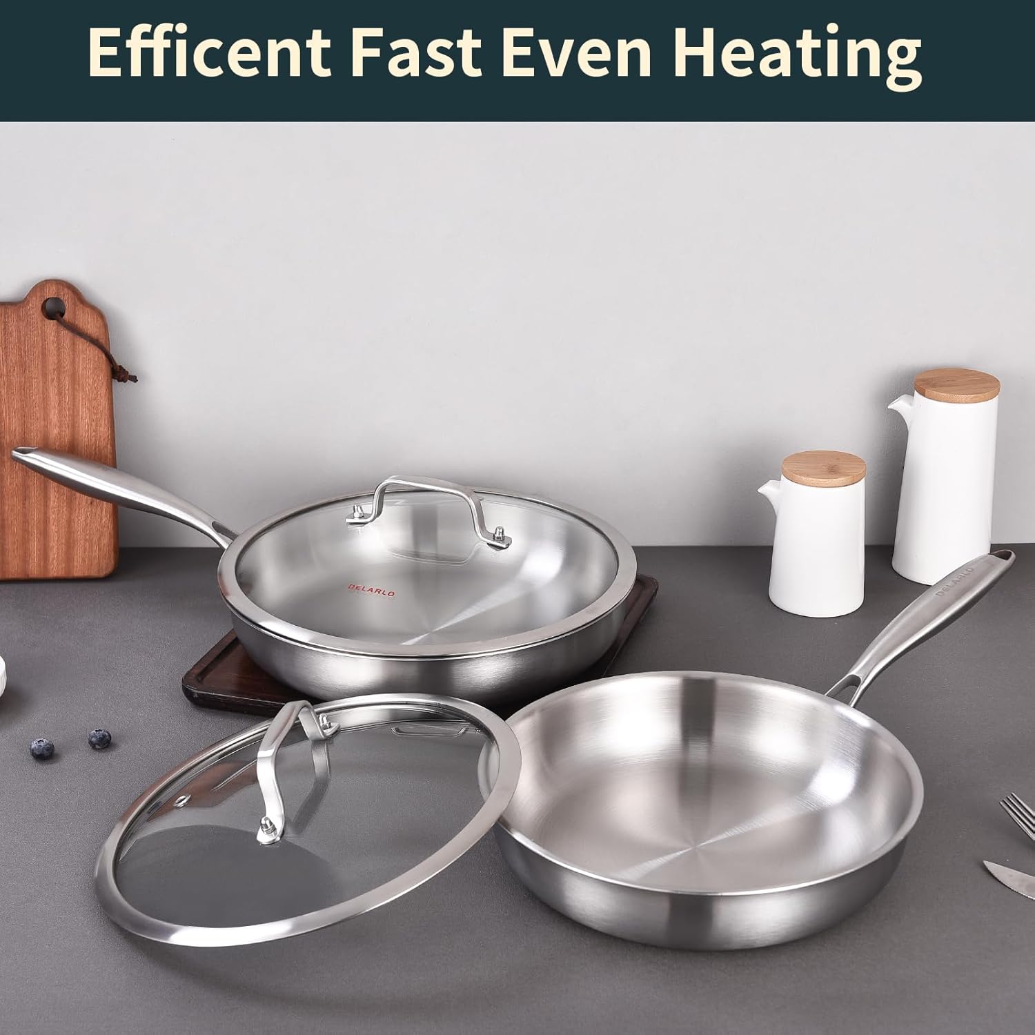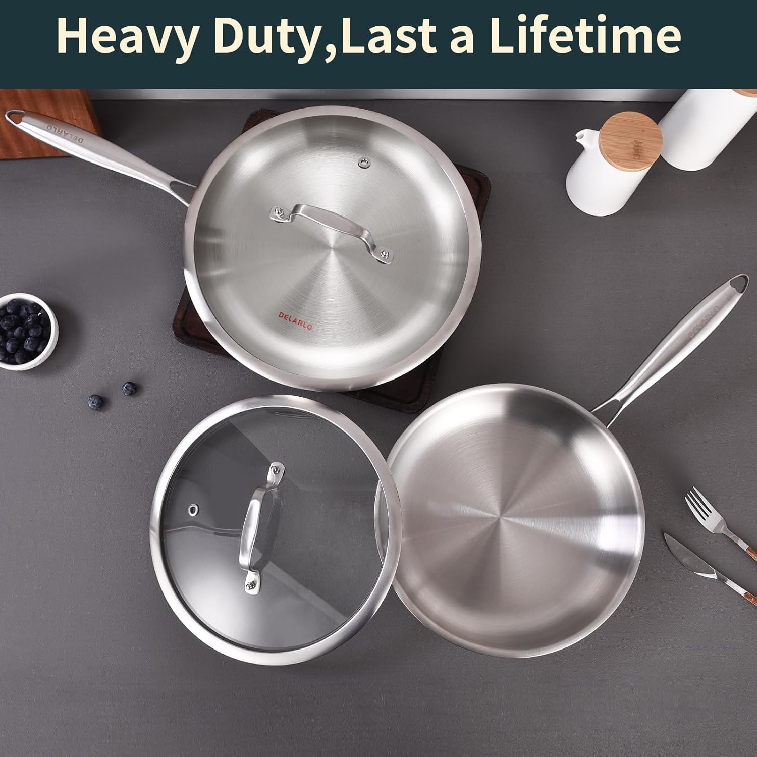 DELARLO Tri-ply Stainless Steel Frying Pan Set with Lid 8" 10" Induction large Skillets Chef's Pan,Pots and Pans Set Kitchen Cookware Set Suitable for All Stove