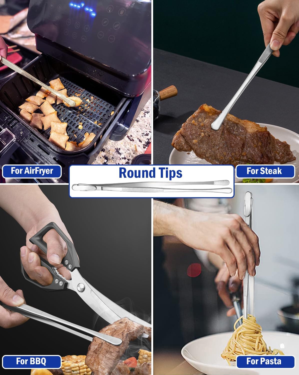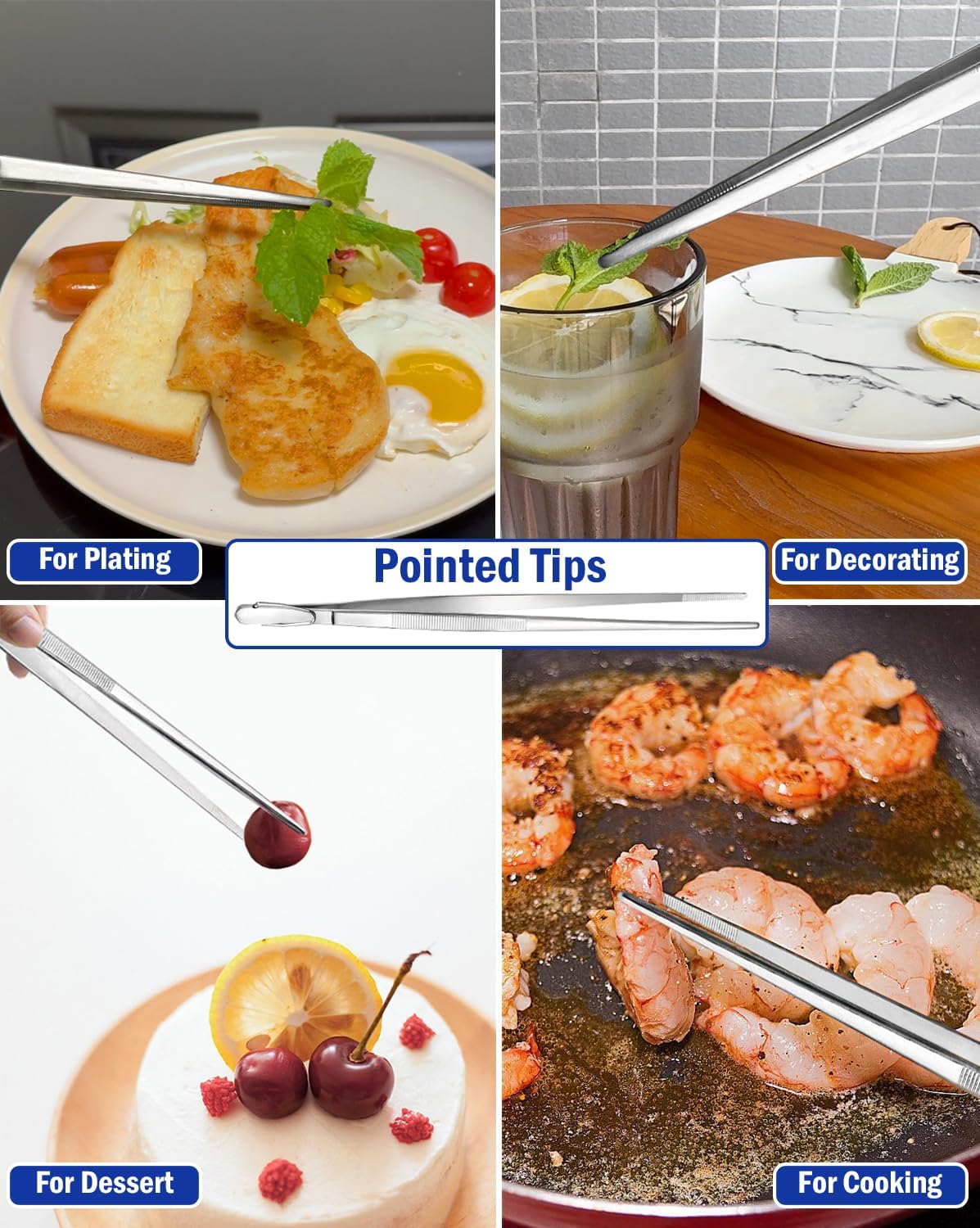 • FOOD GRADE STAINLESS STEEL - Our kitchen tweezers are made of high quality food grade stainless steel, rust-proof, anti-corrosive, sturdy and durability. Extend your reach in the kitchen with these 12" and 10" food tweezer tongs, your hand in the kitchen for cooking, roasting, and plating, that will stand the test of time when exposed to heat, liquid, and awesomeness. Cook and plate with confidence with this high precisionl tweezers.