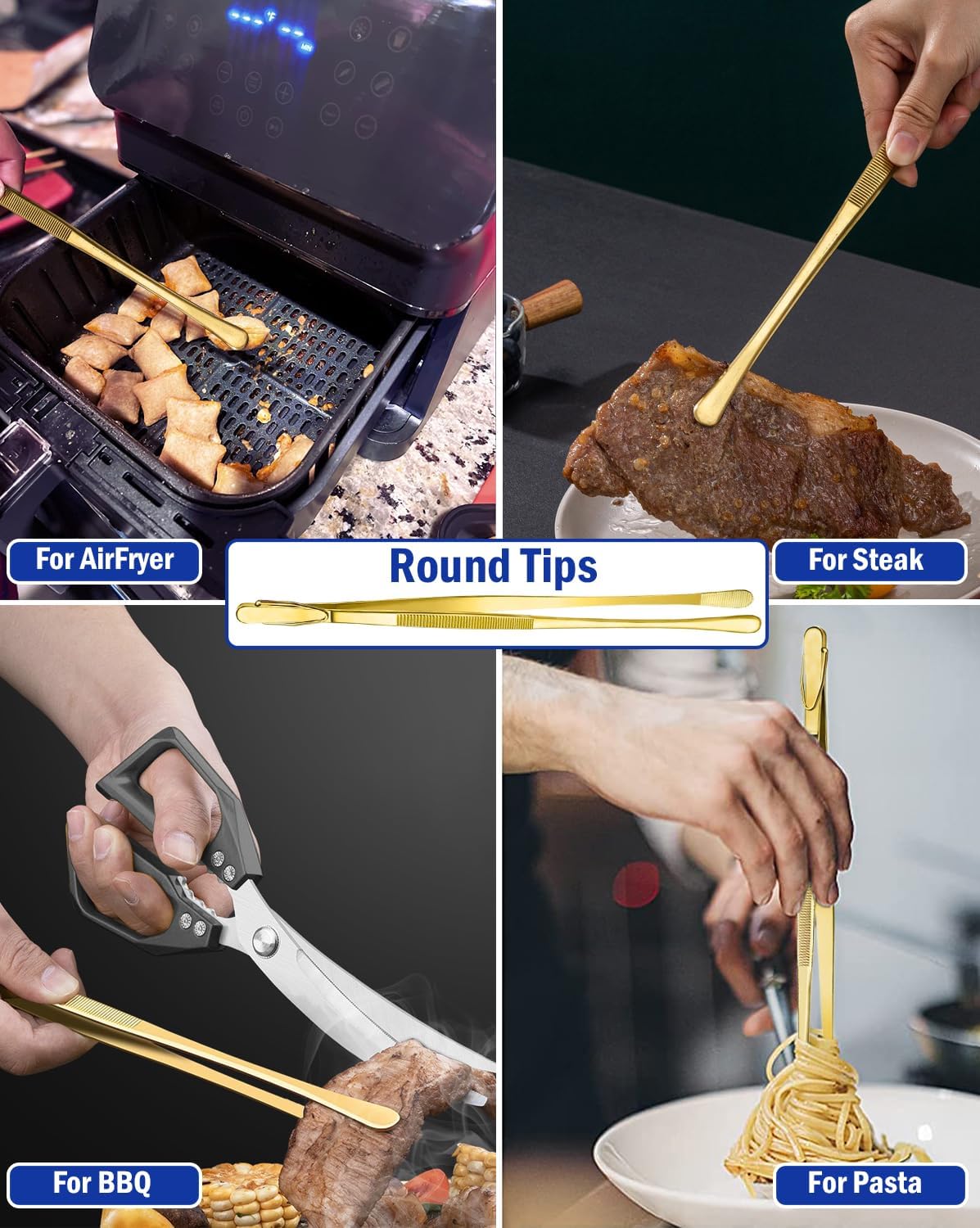 • PROFESSIONAL KITCHEN TWEEZERS SET - This cooking tweezers set includes 4 different designs of 12" and 10" gold tweezers for your daily needs. They are suitable for food styling, plating small and delicate foods like caviar, kernels of corn, pine nuts and cranberries. The long tweezers keeps you away from hot or oil, providing more safety for a happy cooking experience.