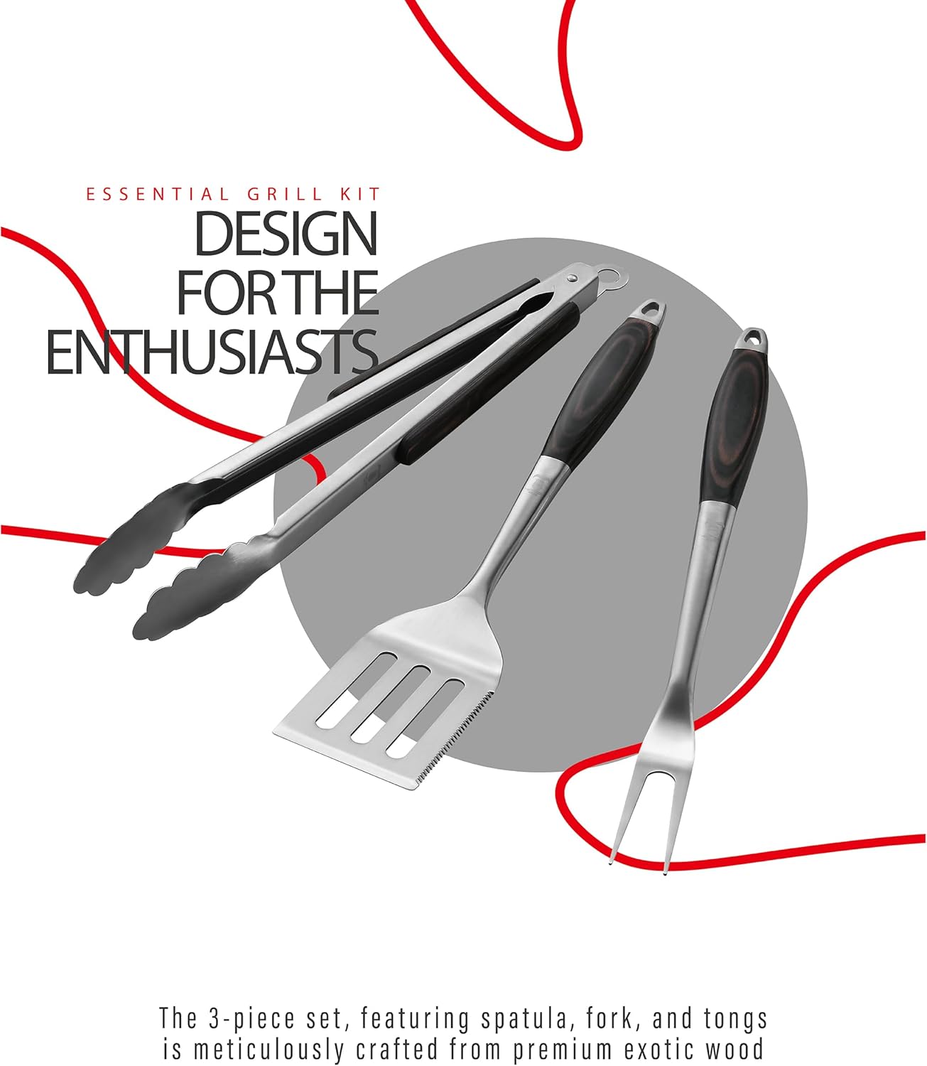 Stainless Steel BBQ Tool Set | Dark-Dyed Wood Handles | Heavy Duty Grilling Accessories | 3-Piece Outdoor Barbecue Grill Utensil Set with Spatula, Fork, and Tongs - Ideal Gift for Men…