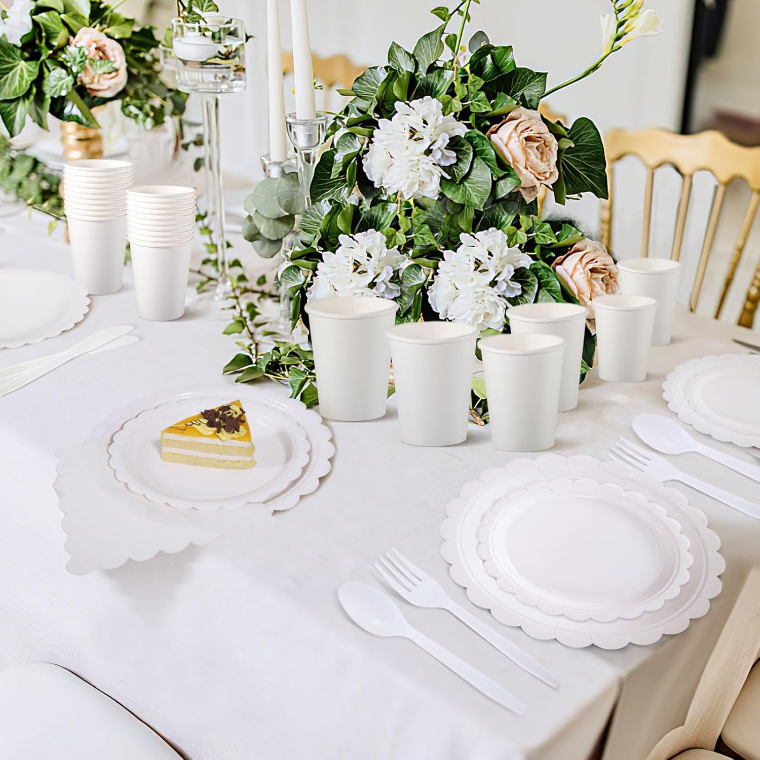 350 Pcs White Paper Plates and Napkins, 50 Guest White Party Supplies Include Scalloped Plates Paper Napkin Cup Plastic Spoon Fork Knive for Baby Shower, Wedding, Birthday