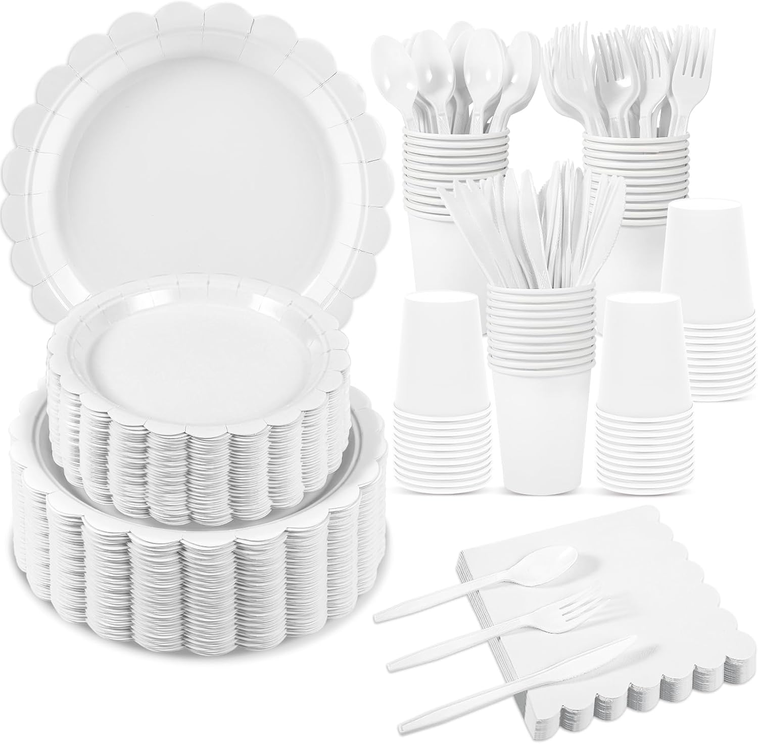 • 350 Pcs White Party Supplies Set:Includes 50 x 9 inch white paper plates, 50 x 7 inch white dessert plates, 50 x 9 ounce paper cups, 50 x 6.5 inch white napkins, 50 plastic forks, 50 knives, and 50 tablespoons