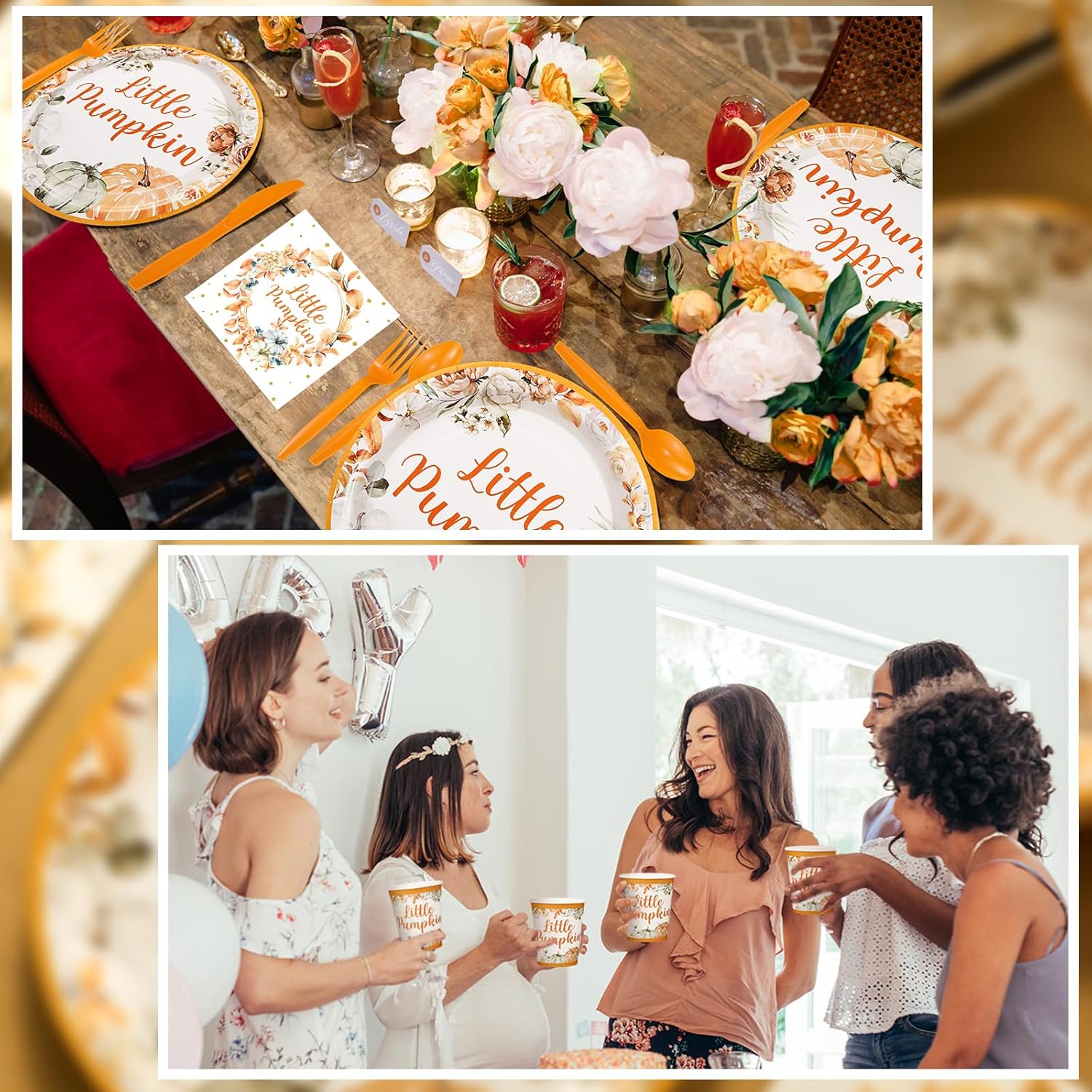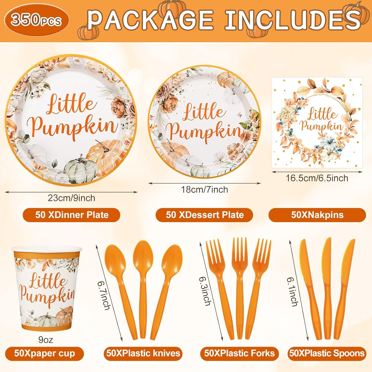 Dandat 350 Pcs Baby Shower Plates Set Baby Shower Party Supplies Serves 50 Tableware Sets Include Plates Napkin Cup Forks Knives Spoons Disposable Dinnerware(Little Pumpkin,Orange)