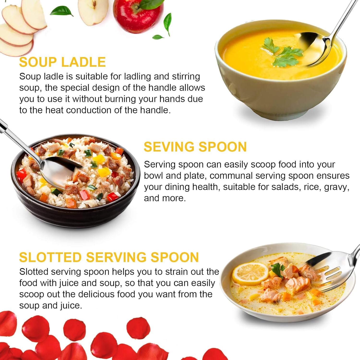 • 【3 Piece Serving Spoons Set】When you buy this stainless steel utensils set, you will get a serving spoon, a slotted spoon, and a soup ladle, the serving spoon can be used to ladle soup or stir salad, the slotted spoon can be used to strain the soup, and the soup ladle can be used to ladle soup or stir the bisque. Thus, the 3 piece stainless steel serving spoons can fulfill your party needs