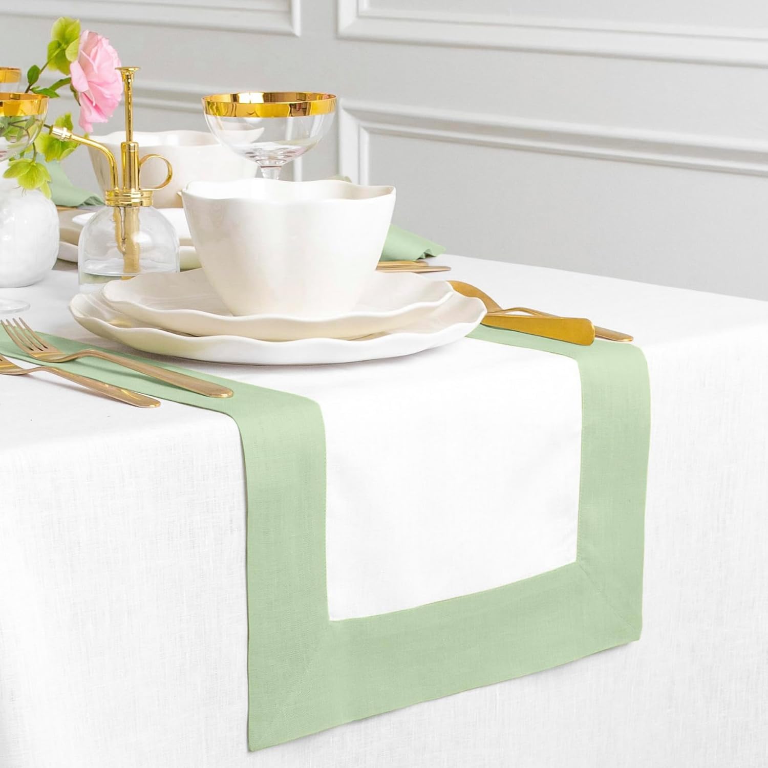• 𝗖𝗼𝗺𝗽𝗼𝘀𝗶𝘁𝗶𝗼𝗻 𝗮𝗻𝗱 𝗖𝗿𝗮𝗳𝘁𝘀𝗺𝗮𝗻𝘀𝗵𝗶𝗽 : 100% Pure European Flax Linen Light Green and White Thanksgiving Table Runner - 𝗖𝗼𝗻𝘁𝗲𝗺𝗽𝗼 | Handcrafted By Skilled Artisans.