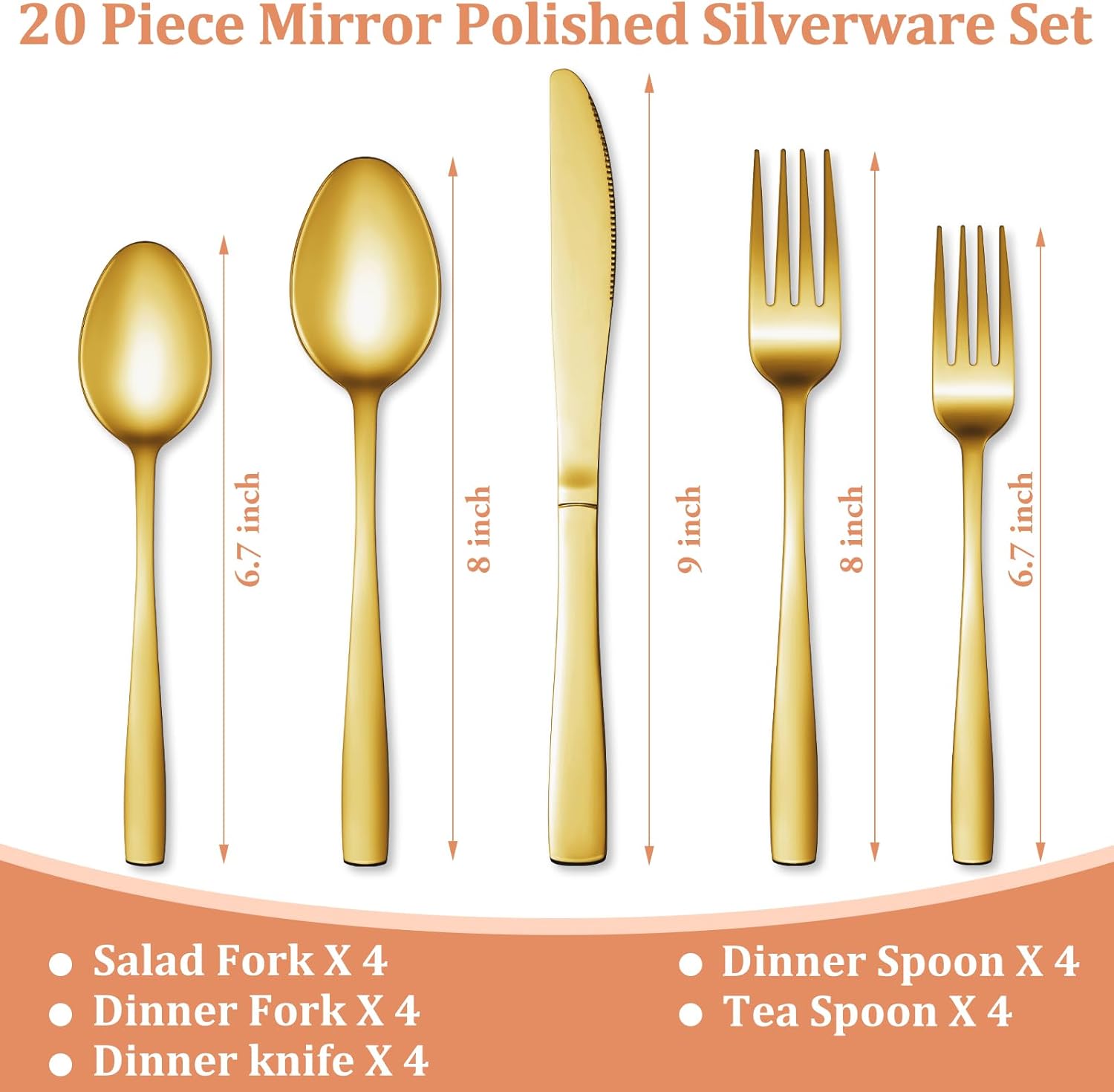 20 Pcs Gold Silverware Set, Stainless Steel Flatware Set for 4, Food-Grade Cutlery Set, Mirror Polished Tableware Eating Utensils Set for Home Kitchen, Include Knife Fork Spoon Set, Dishwasher Safe