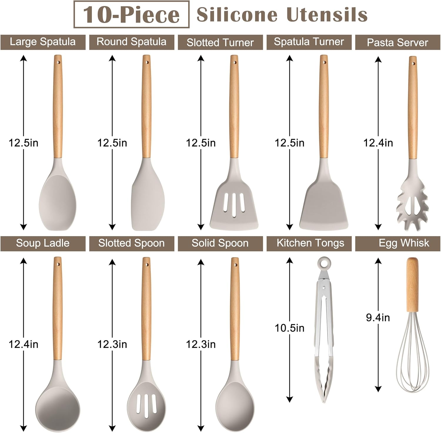 • 10-PIECE KHAKI SILICONE UTENSILS- Contains Soup ladle, Spatula Turner, Slotted turner, Large spatula, Pasta Server, Slotted spoon, Solid spoon, Round spatula,Kitchen tongs and Egg whisk, The range of utensils covers all your cooking needs, From stirring to flipping and serving, Ideal gift