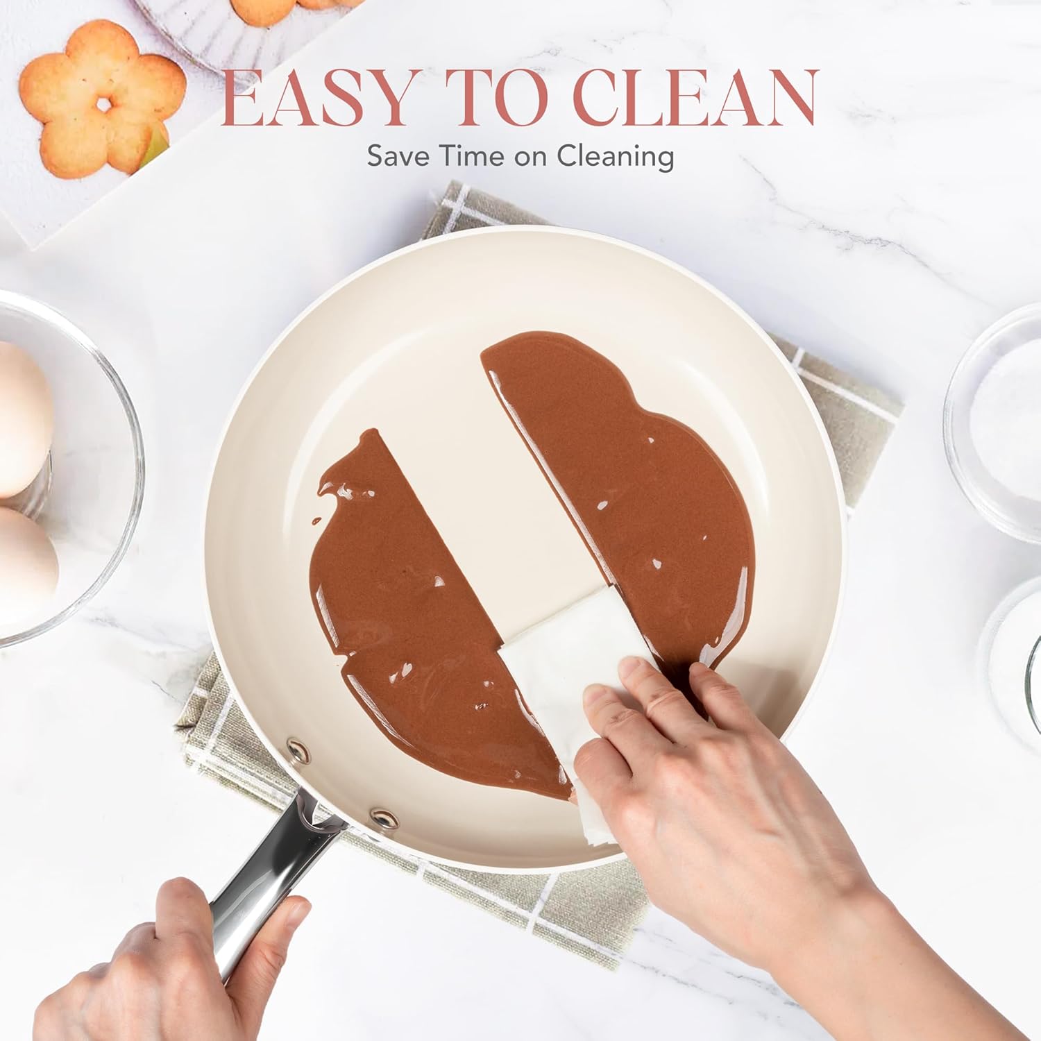 • Healthy Cooking Experience - Prioritize your health with our ceramic pans, free from PTFE, PFOA, lead, and cadmium. Enjoy cooking without worrying about harmful chemicals leaching into your food.