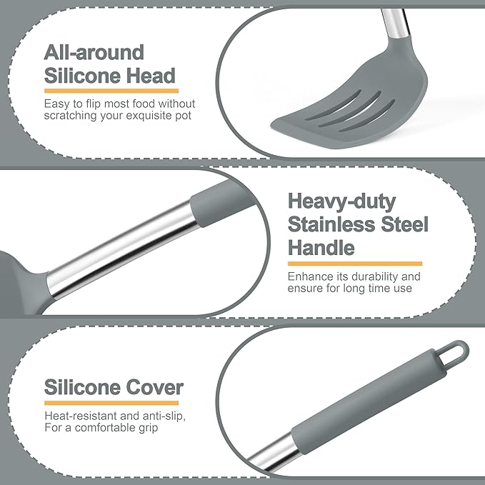 • 【Excellent Designs】All silicone utensils have smooth surfaces without rough spots, Adds a non-slipping cover on the handle end to avoid your hand get scalding, Ergonomic design of inclined angle structure between head and handle, Helping to save your effort when using, Spatula turners are designed with flexible head and slight beveled edge on the head, Perfect to slide under different food easily and comfortable to flip and fry food