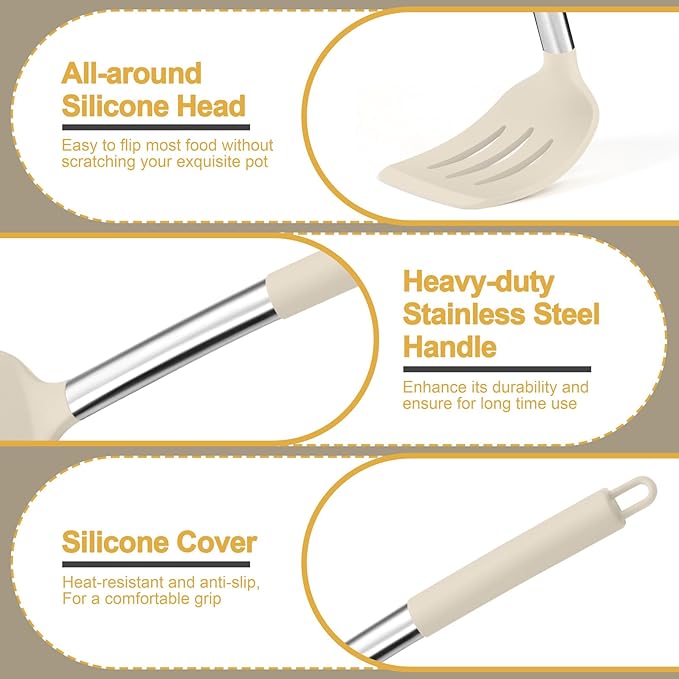 P&P CHEF Khaki Kitchen Cooking Utensil Set of 4, Silicone Solid Spatulas Slotted Spoons Turners for Non-stick Cookware Flipping Mixing, Heat-proof