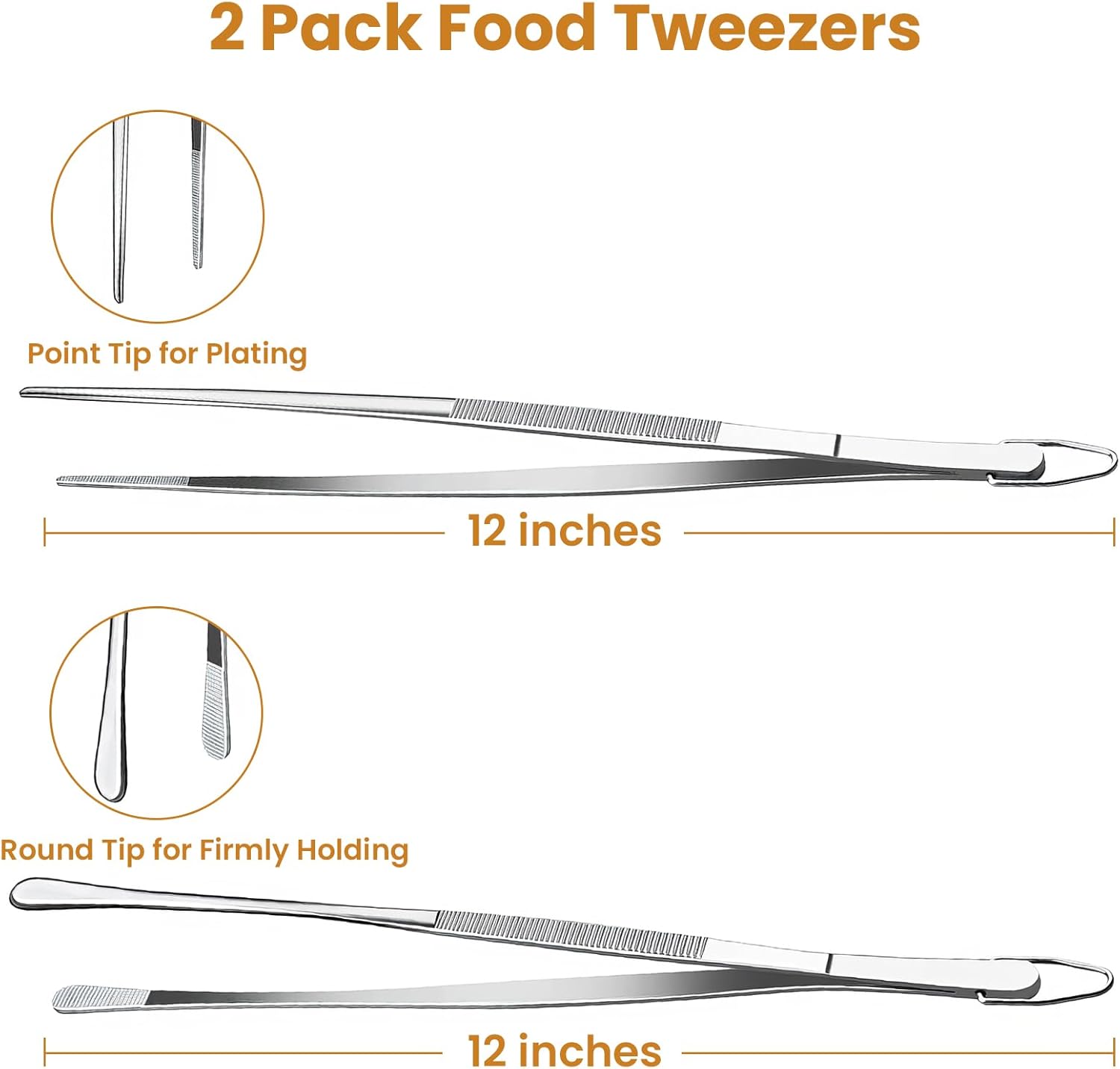 • [PACKAGING CONTENT] Package contains two 12-inch kitchen tweezers. One features a precision serrated tip for a secure grip, while the other has a smooth, rounded tip for delicate tasks. Both are easy to clean and store.