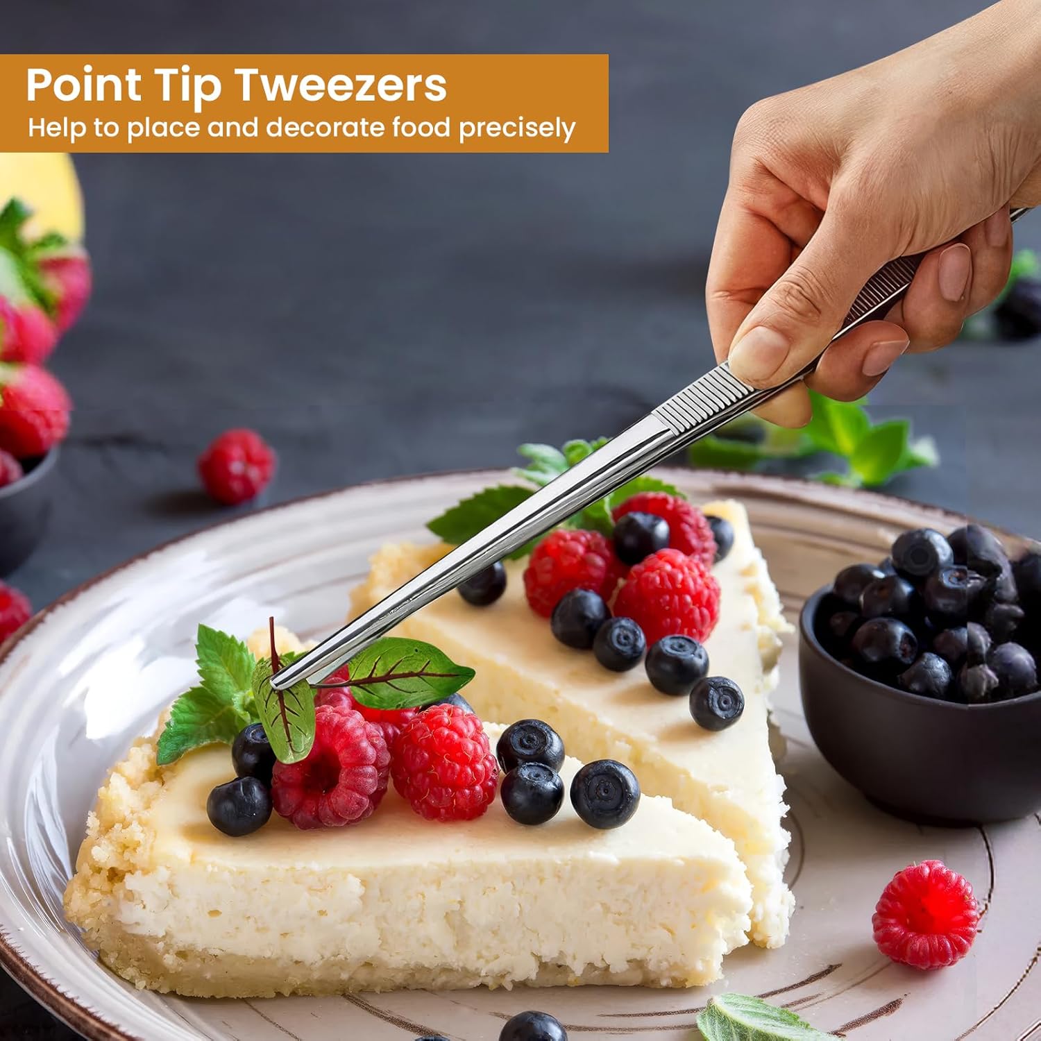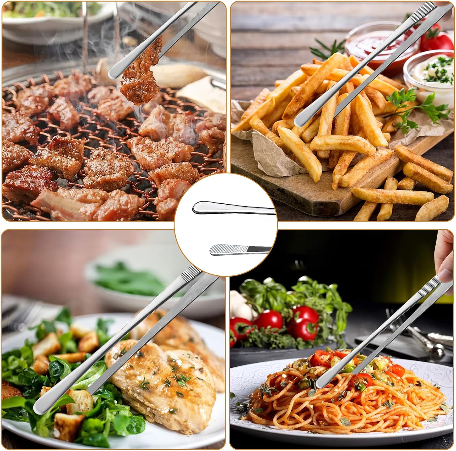 • [MULTI-PURPOSE USE] The bottom tips have 2 different styles. One with round tips which is fit for cooking, BBQ, steak, repairing and roasting. The other tweezers tong with point tips are suitable for decorating delicate stuff such as cake, salad and other desert. Also for feeding small animals and plant maintenance, aquarium tools, etc.These cooking tweezers can make your cooking easier and more convenient.