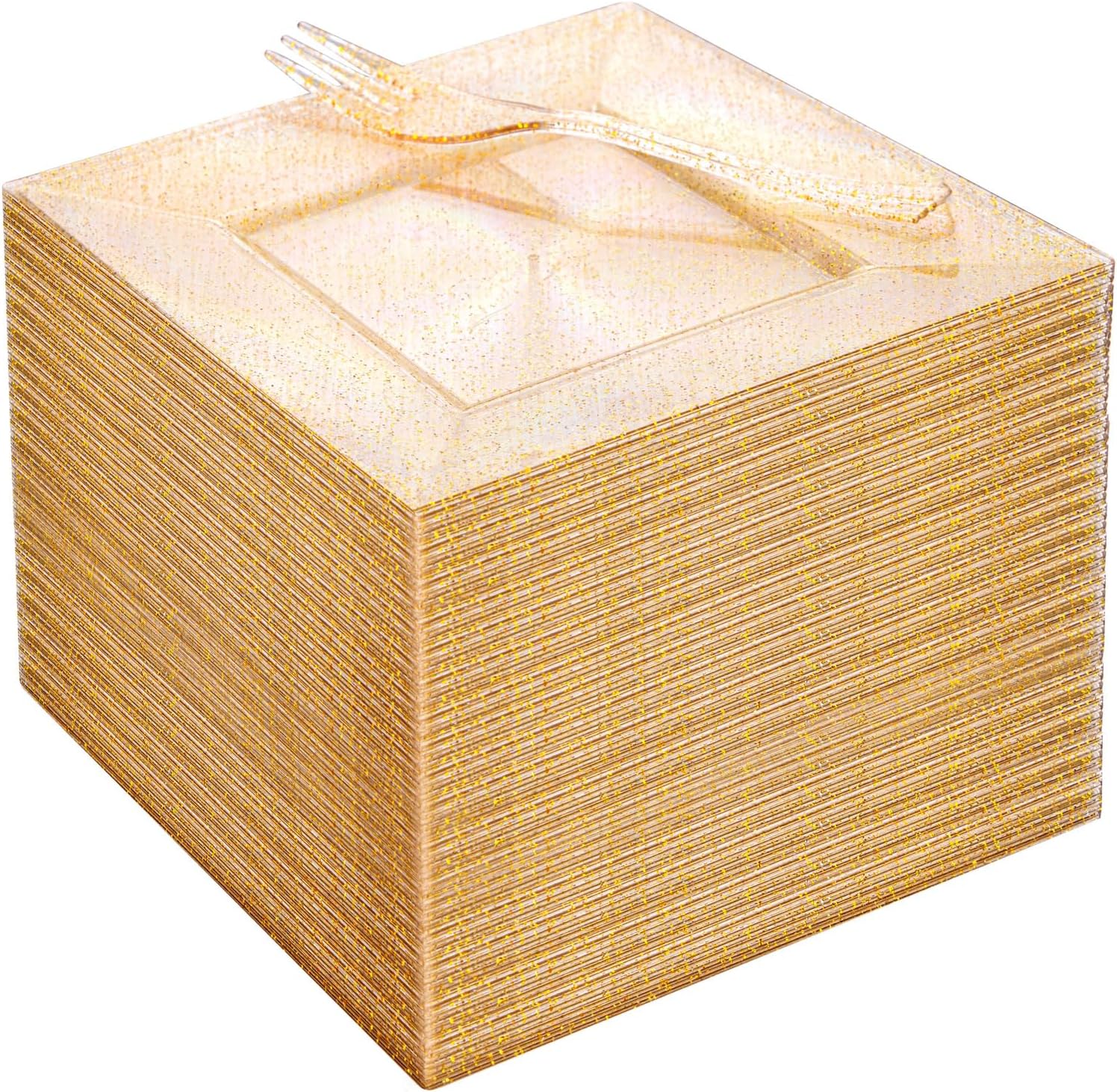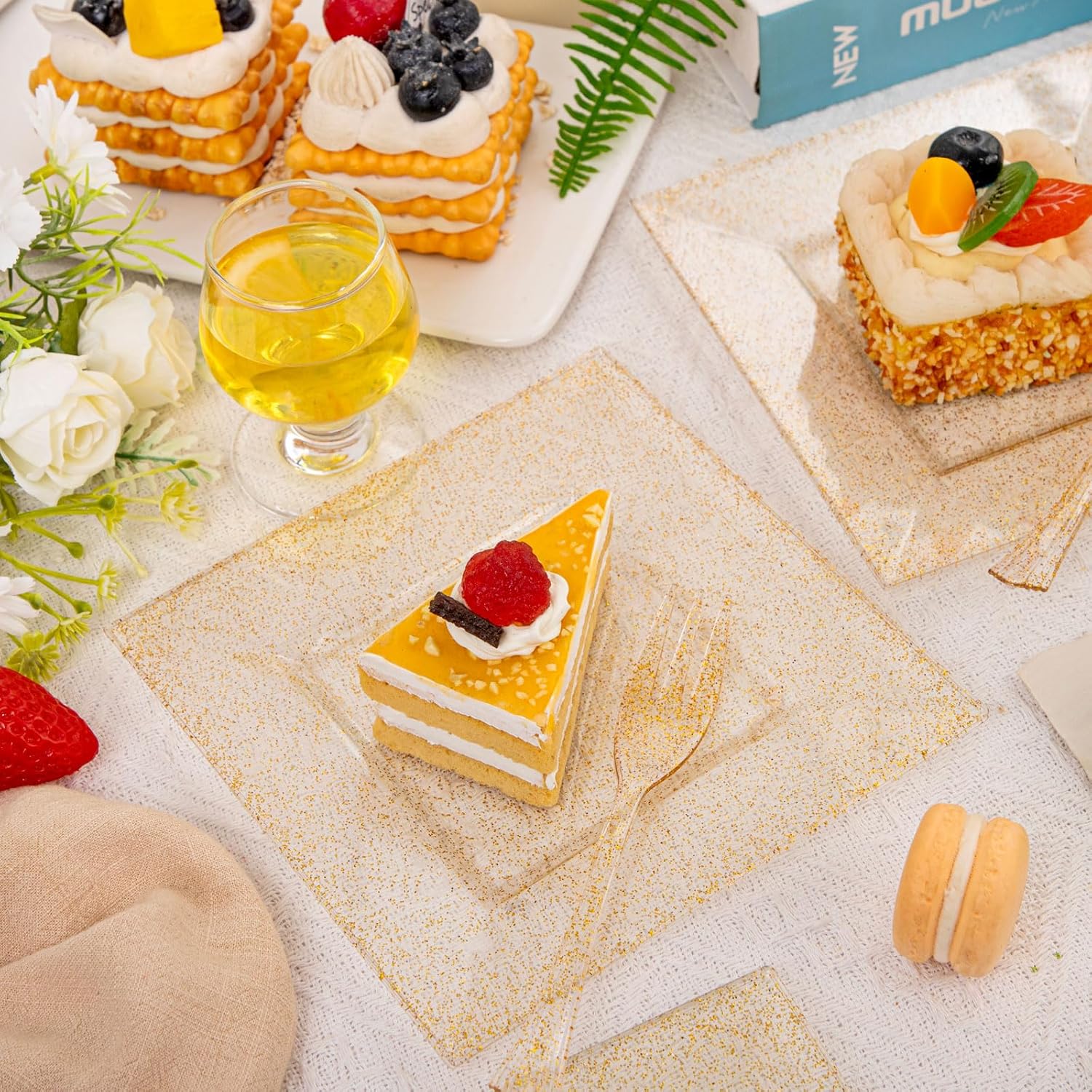DaYammi 100Pcs Gold Glitter Dessert Plates Including 50Pcs Appetizer Plates 6",50Pcs Plastic Forks 5.7",Gold Glitter Plastic Square Plate for Party,Gold Salad Plate with Cake Fork for Birthday Wedding