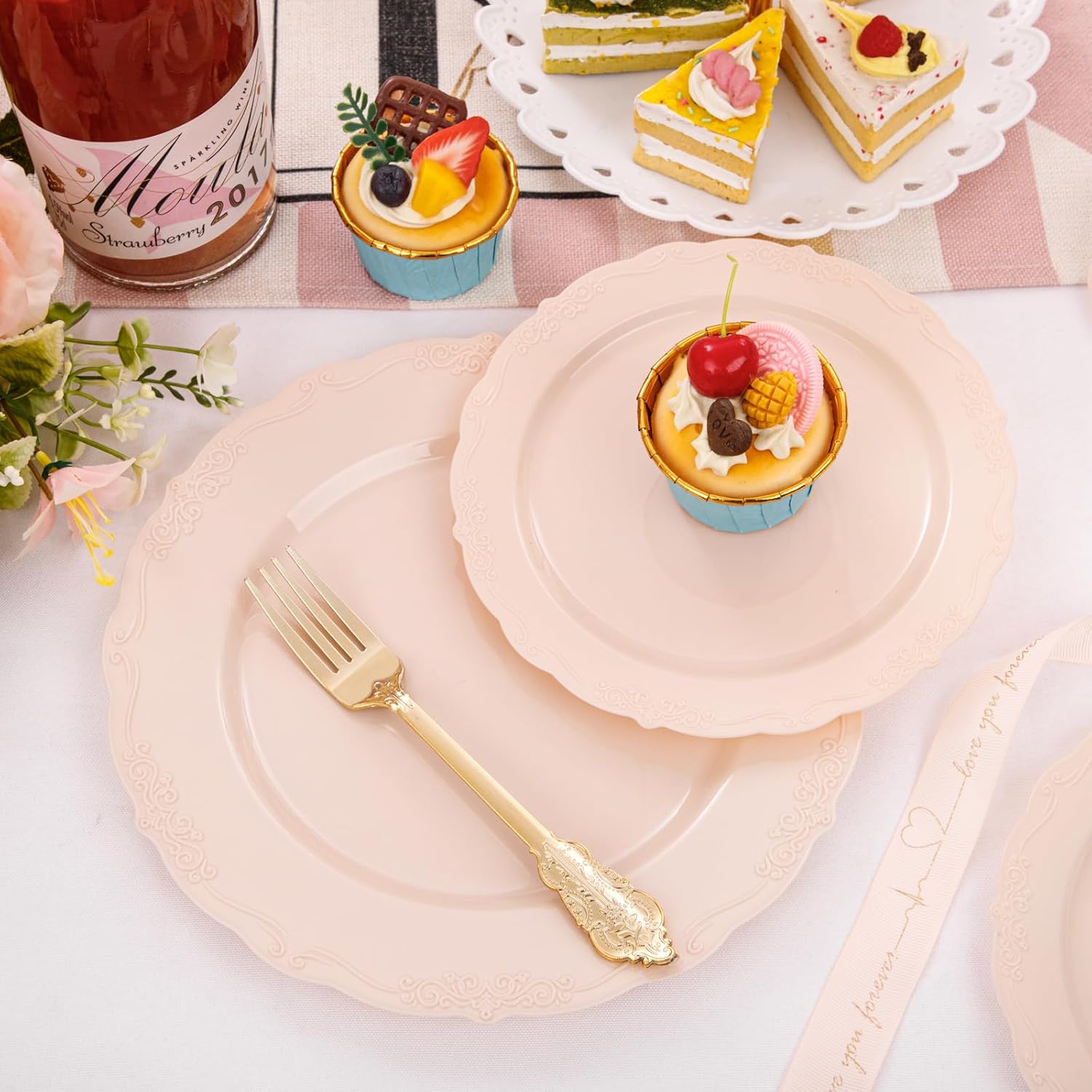 • GRACEFUL DESIGNS: The modern and elegant pink plastic plates looks like china, combines with classic lace would make them more beautiful. The bottom of the gold plastic cutlery also has a delicate lace, for your guests to add pleasure to the meal.