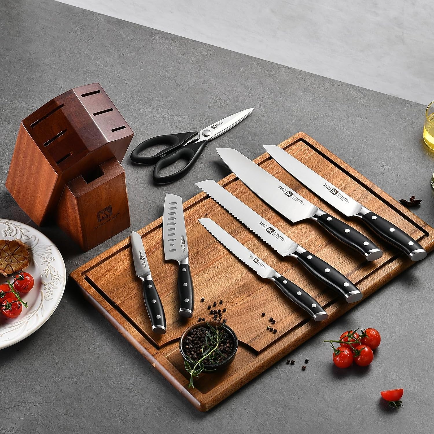 • 【8 in 1 Knife Block Set】STAHL 8 pieces knife block set, an affordable and practical starter knife set to your kitchen, meets everyday kitchen tasks including cutting, slicing, chopping, dicing, and mincing, suitable for processing all ingredients such as meats, fish, fruits, vegetables and bread with a range of useful knives choices consisting of 8" Chef's Knife, 8" Bread Knife, 8" Carving Knife, 6" Utility Serrated Knife, 5.5" Santoku Knife, 3.5" Paring Knife and Solid Wooden Block.