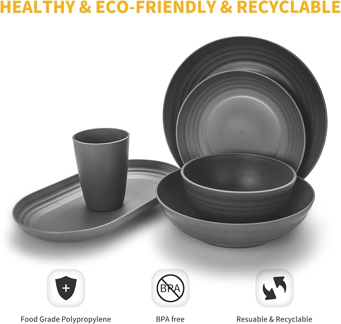 • RECYCLABLE MATERIALS: The dinnerware set is made from natural organic wheat straw and food grade PP. 100% BPA free, gluten free, non-toxic, odorless, safe and hygienic. Every purchase helps to avoid wasting and burning wheat straw, making the air fresher, and everyone's life more healthier