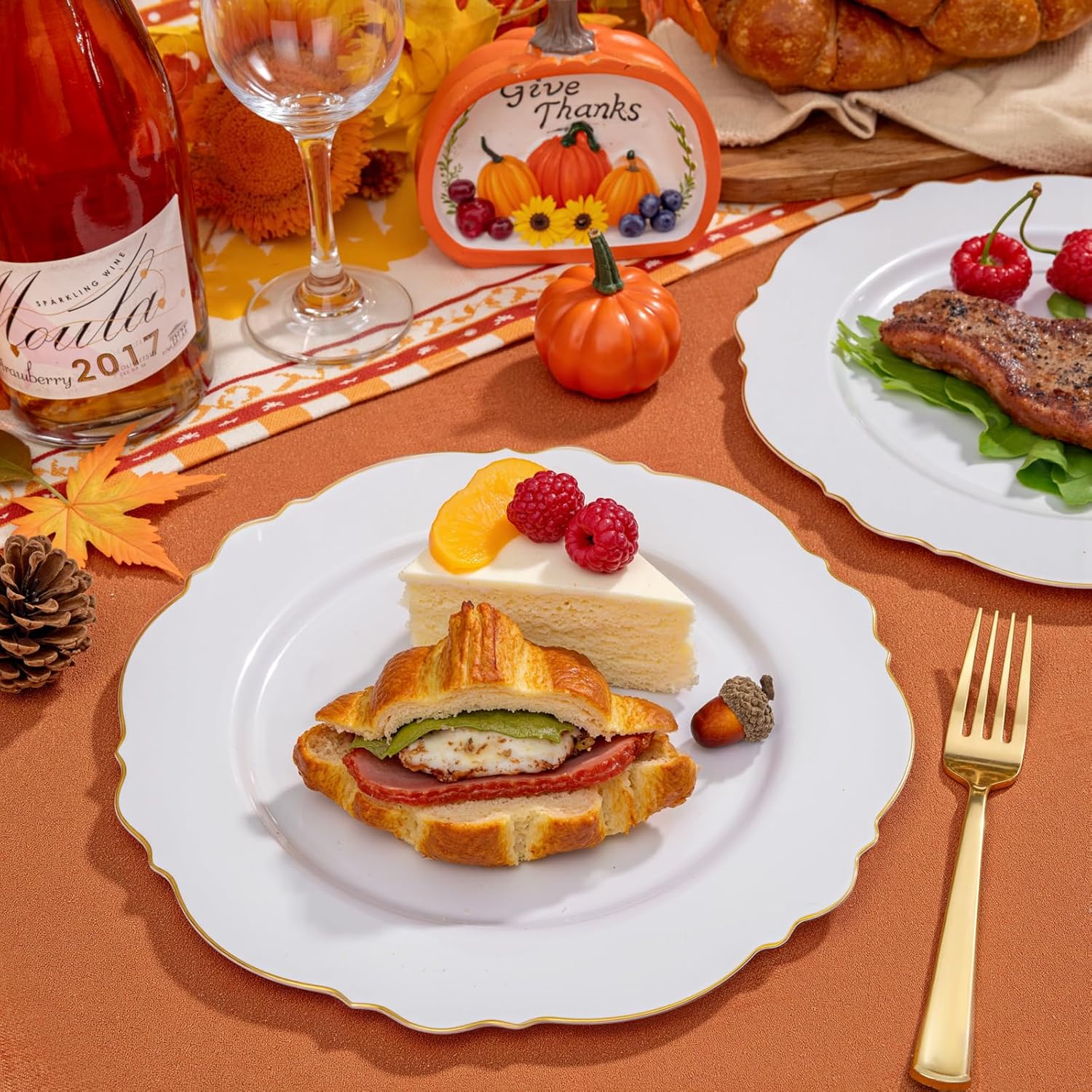 WDF 60pcs Gold Plastic Dinner Plates -10.25inch Baroque White and Gold Plates Fancy Heavy Duty Fall Plastic Plates for Upscale Thanksgiving Parties & Wedding & Birthday