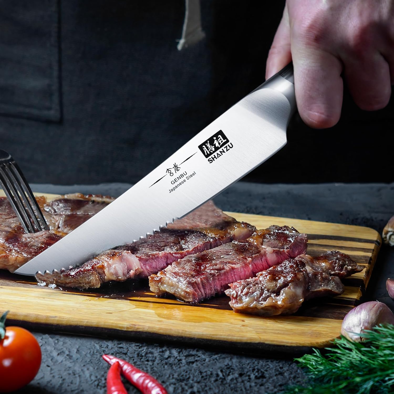 SHAN ZU 6 Pc Steak Knife Set, 4.5 Inch High Carbon Japanese Super Steel Steak Knives, Ultra Sharp Kitchen Steak Knife with K133 Ergonomic Handle, Black Tortoise Genbu Series