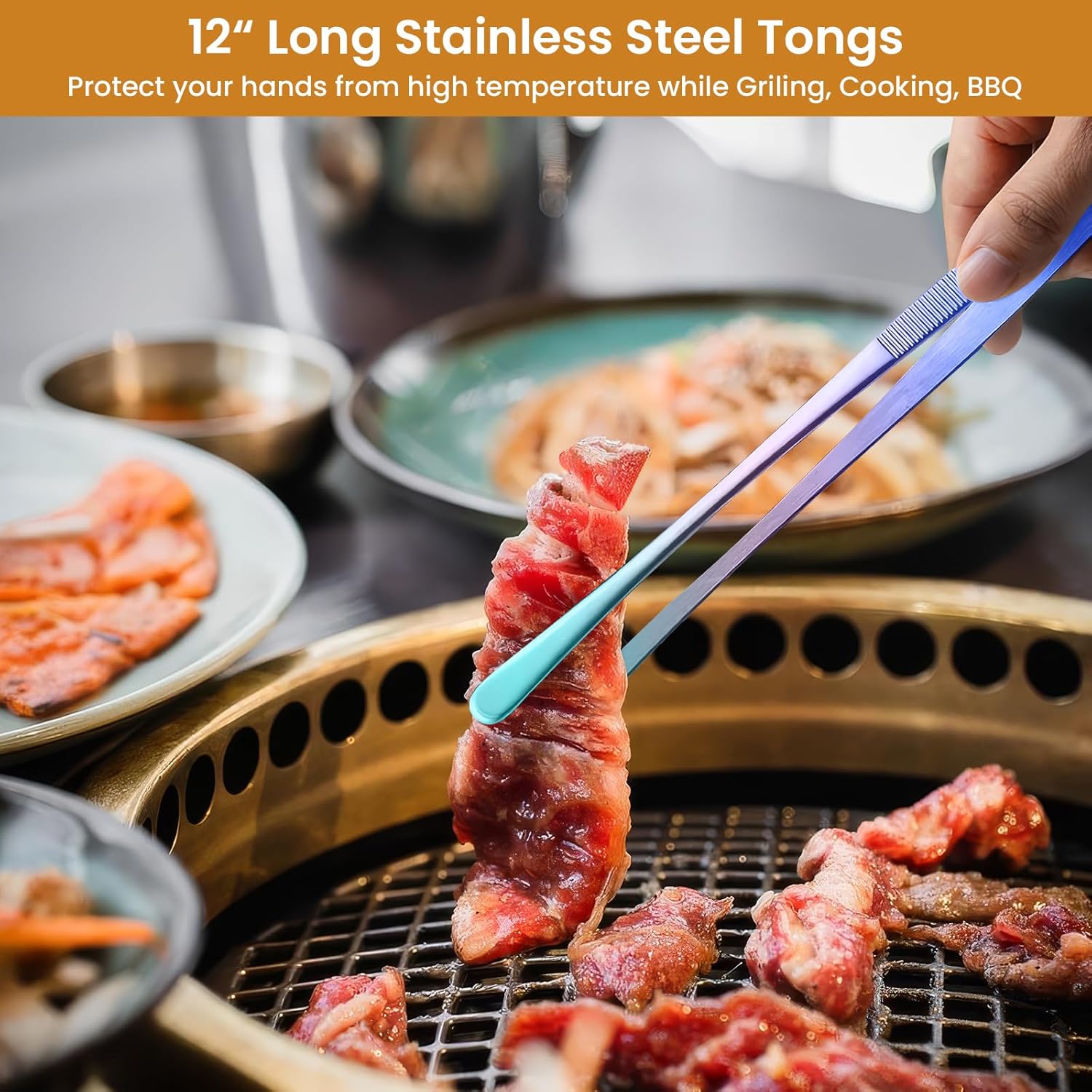 • [PACKAGING CONTENT] Package includes four kitchen tweezers: two 12-inch (long) and two 10-inch (short). This combination allows for versatile use in various cooking tasks, from handling large items on the grill to precise plating. All are easy to maintain and store.