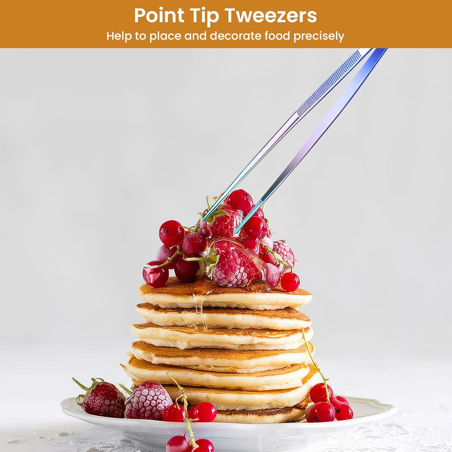 • [MULTI-PURPOSE USE] The bottom tips have 2 different styles. One with round tips which is fit for cooking, BBQ, steak, repairing and roasting. The other tweezers tong with point tips are suitable for decorating delicate stuff such as cake, salad and other desert. Also for feeding small animals and plant maintenance, aquarium tools, etc.These cooking tweezers can make your cooking easier and more convenient.