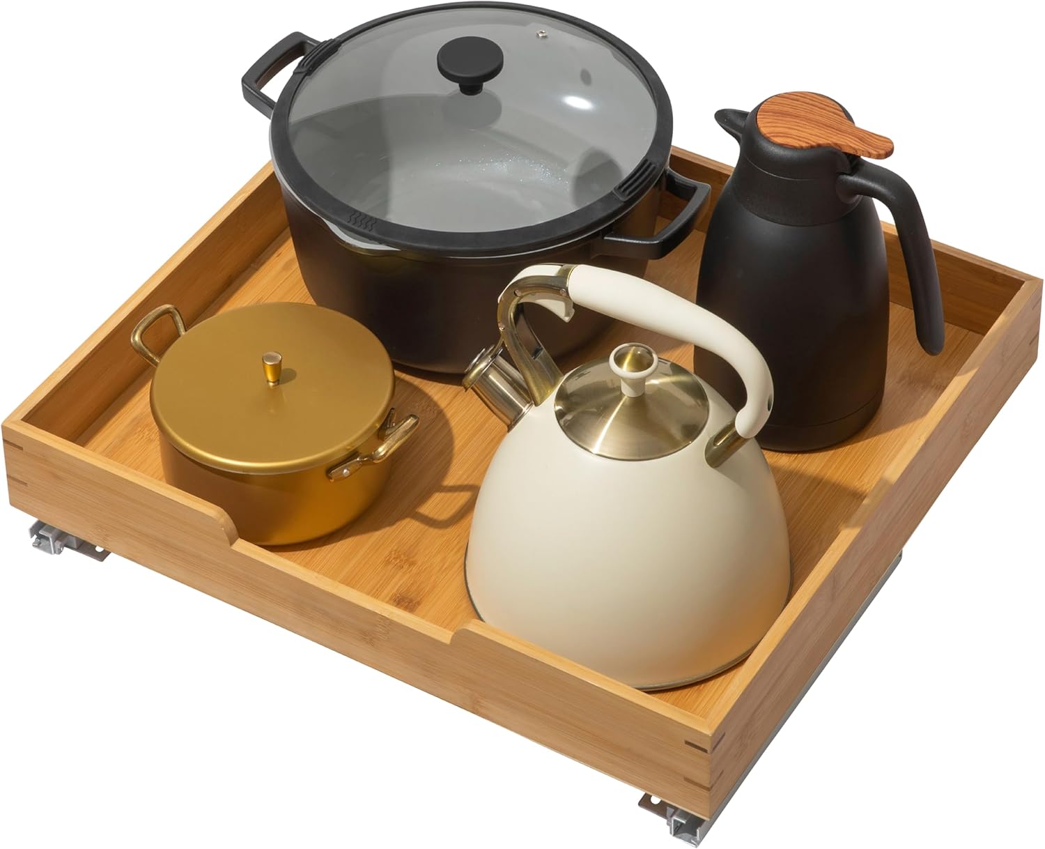 HOLDN’ STORAGE Bamboo Wooden Pull out Cabinet Organizer 20" W x 21" D - Requires At Least a 21.25" W x 21" D. Cabinet Opening. W/Lifetime Limited Warranty. Bamboo Tray and Heavy gauge metal rails.