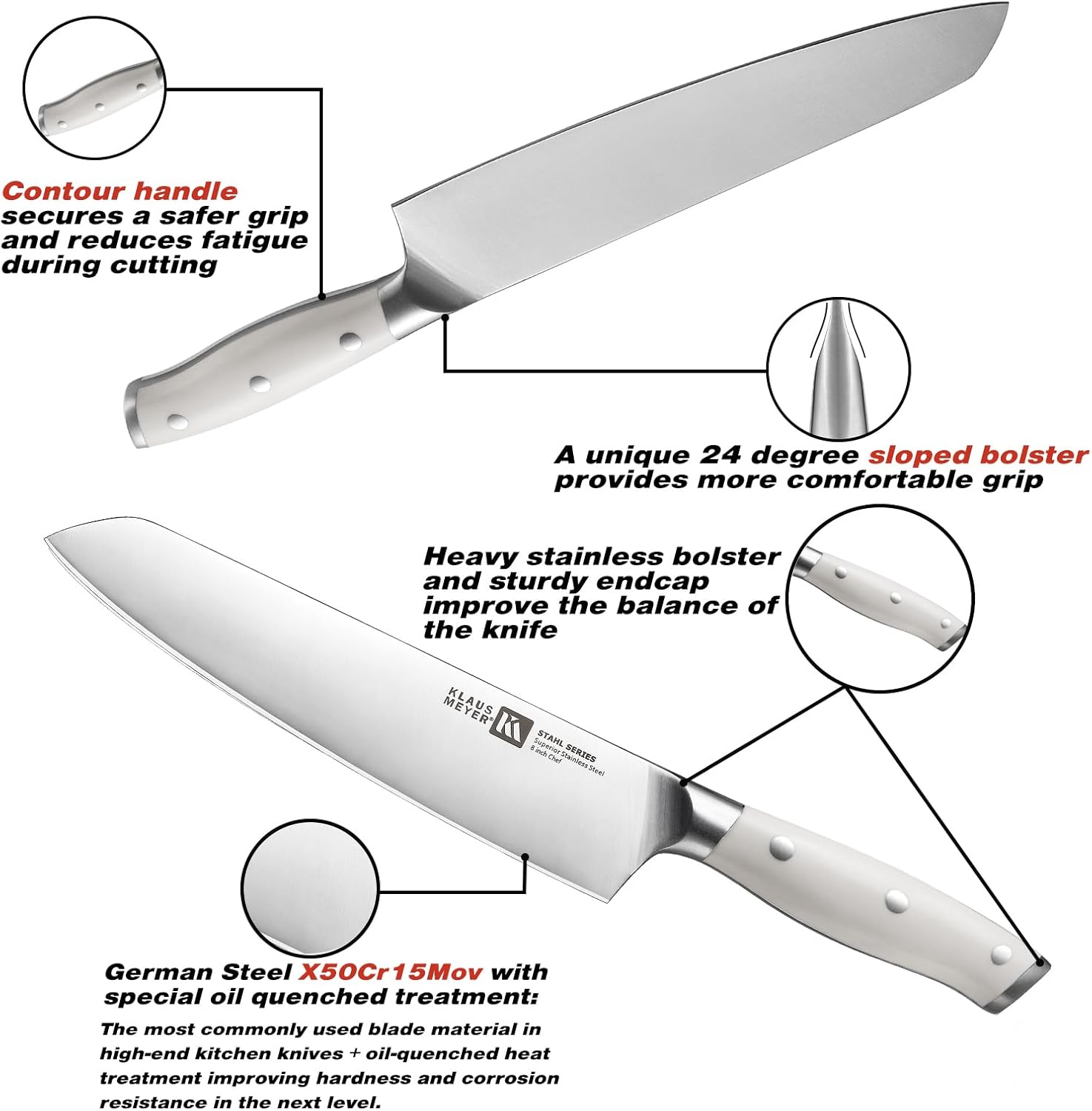 • 【Guaranteed Choice】WE PURSUE HIGHEST QUALITY, NOT PRICE! 10-year warranty keeps off any defect and imperfection of the knives, making it impeccable after delivery. Klaus Meyer Knife is your ideal choice in kitchen or gift for your loved ones.