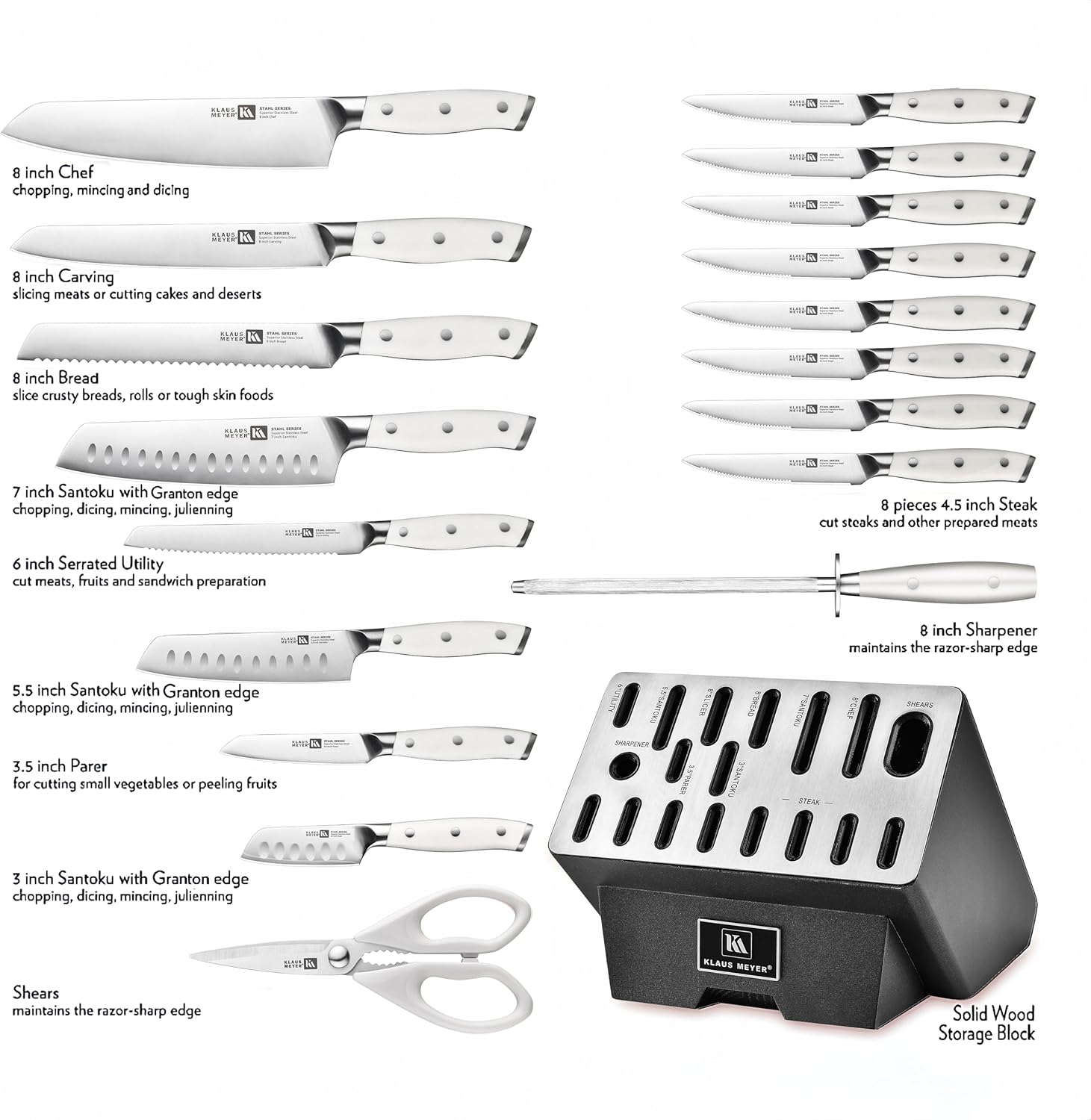 Klaus Meyer Stahl 19 Piece High Carbon Exclusive German Steel Knife Block Set (White)