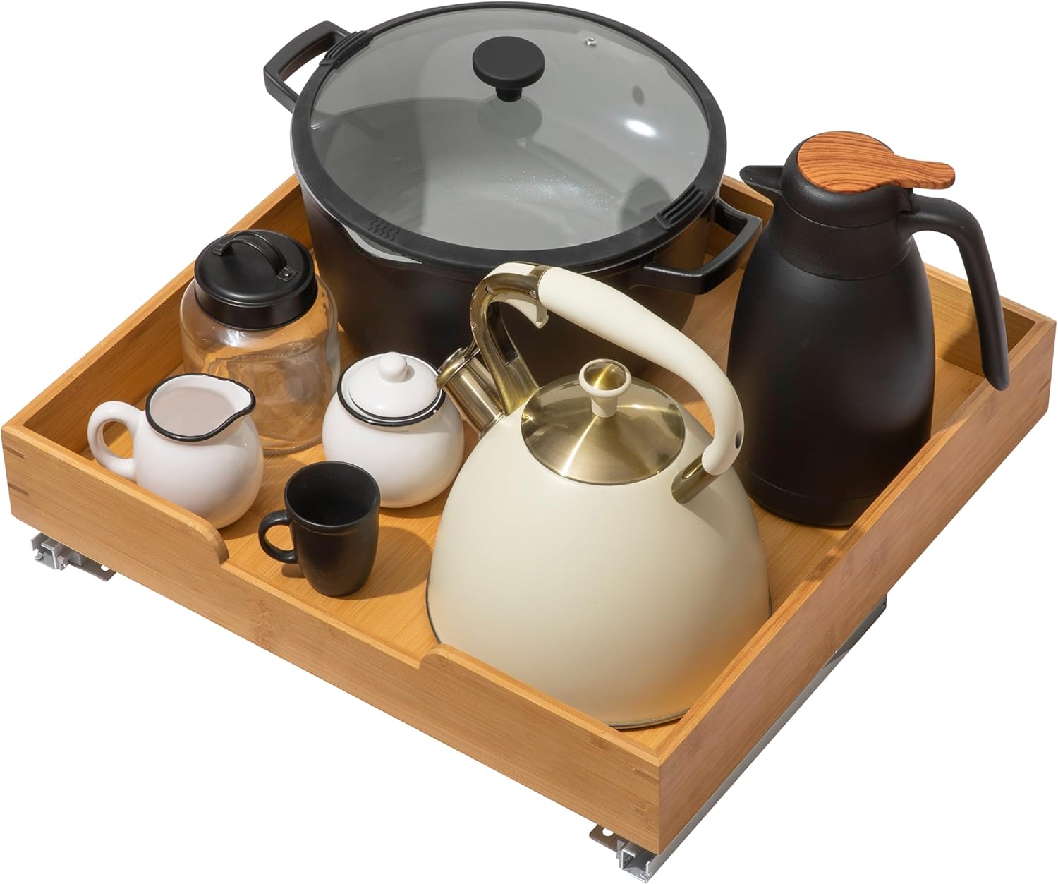 HOLDN’ STORAGE Bamboo Wooden Pull out Cabinet Organizer. 22" W x 21" D - Requires At Least a 23.25" W x 21" D. Cabinet Opening. W/Lifetime Limited Warranty. Bamboo Tray and Heavy gauge metal rails