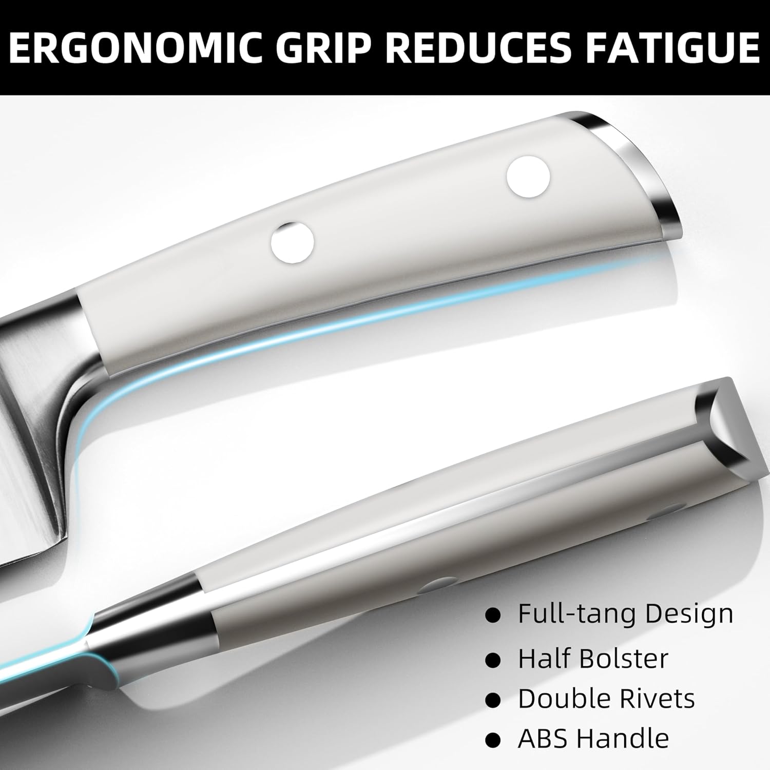 • 【Ergonomic Design】Crafted for comfort, this knife features an ergonomic design and premium handle for a fatigue-free grip. The full tang and half-bolster provide stability, allowing extended periods of effortless cutting.