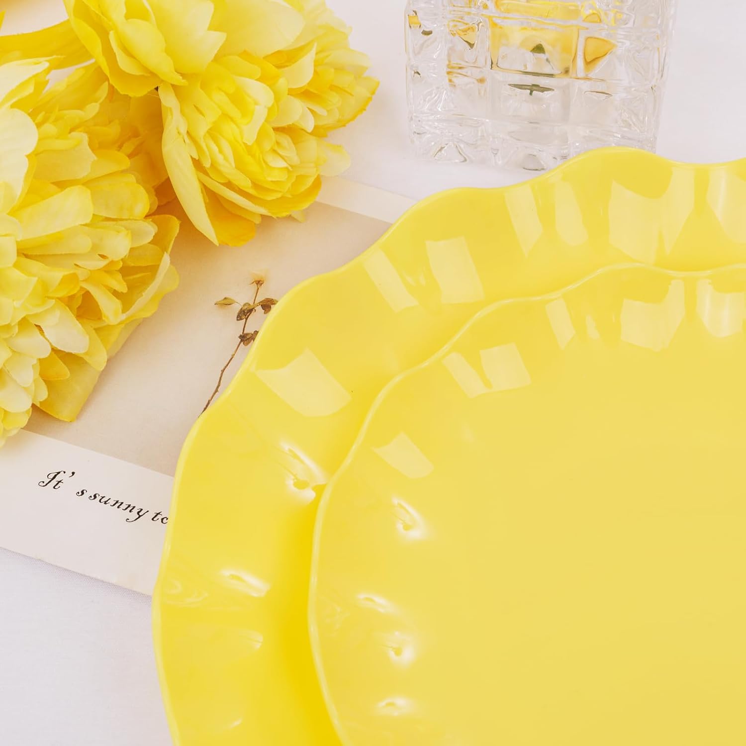 • High Quality:Crafted from food-grade,plastic,our Yellow Plastic Plates Reusable add a touch of sunshine to your table setting.The set includes 12 dessert plates and 12 dinner plates,each featuring a sturdy design in a charming scalloped shape,ideal for both casual meals and special occasions.