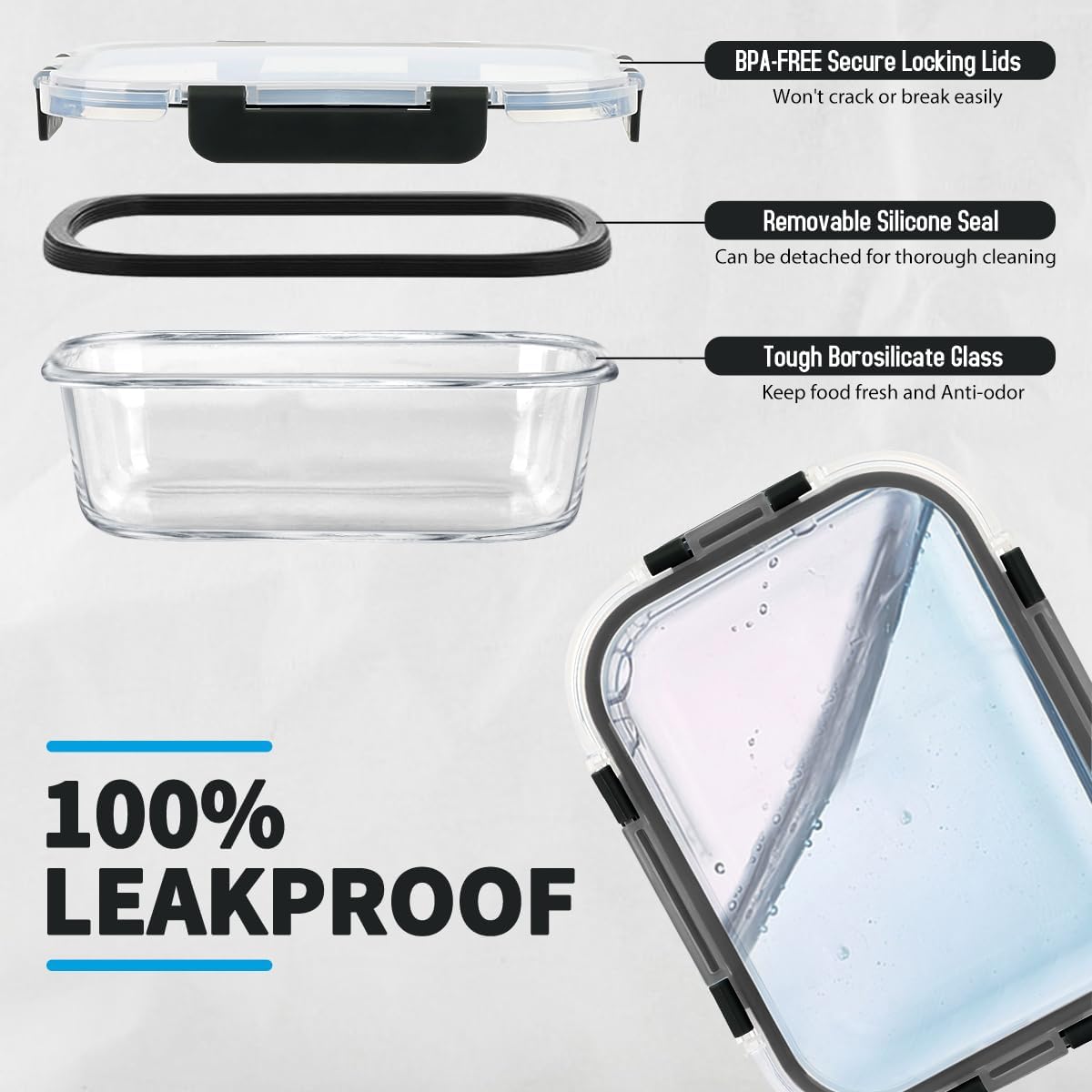 42pcs Glass Food Storage Containers with Snap Locking Lids Set, Glass Meal Prep Containers (21 Container & 21 Lids),Leak Proof Lunch Containers BPA-Free,Black