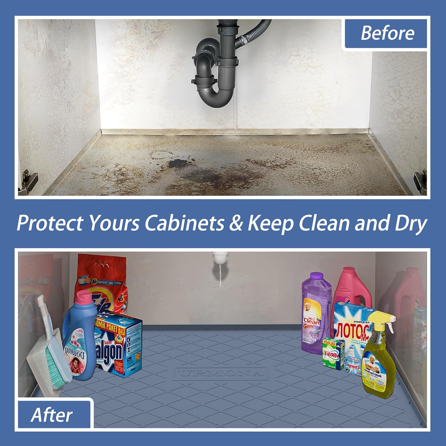 • 【Cabinet Protector Mats】Sink mats for bottom of kitchen sink cabinets from damage caused by plumbing leaks, chemical and product spills, stains, and scratches. Under sink organizers and storage can save you hundreds of dollars in cabinet repair costs. Ideal for kitchens, bathrooms or utility rooms.