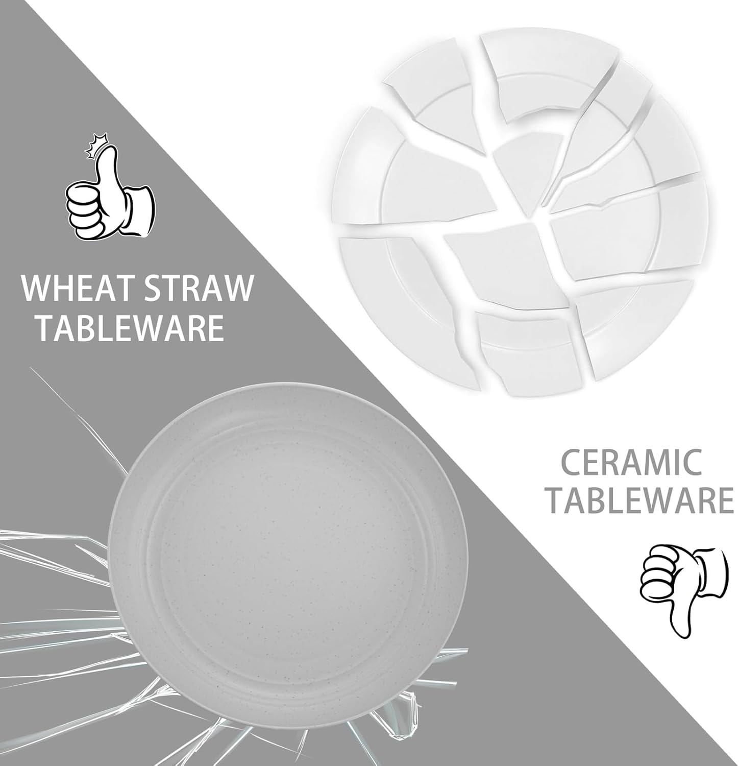 LIYH 48 Pcs Light Grey Plastic Wheat Straw Dinnerware Plates and Bowls Set,Camping Dish Set for 12, Dishwasher Safe Dinnerware Sets, Unbreakable Plates,Camping Dish Sets