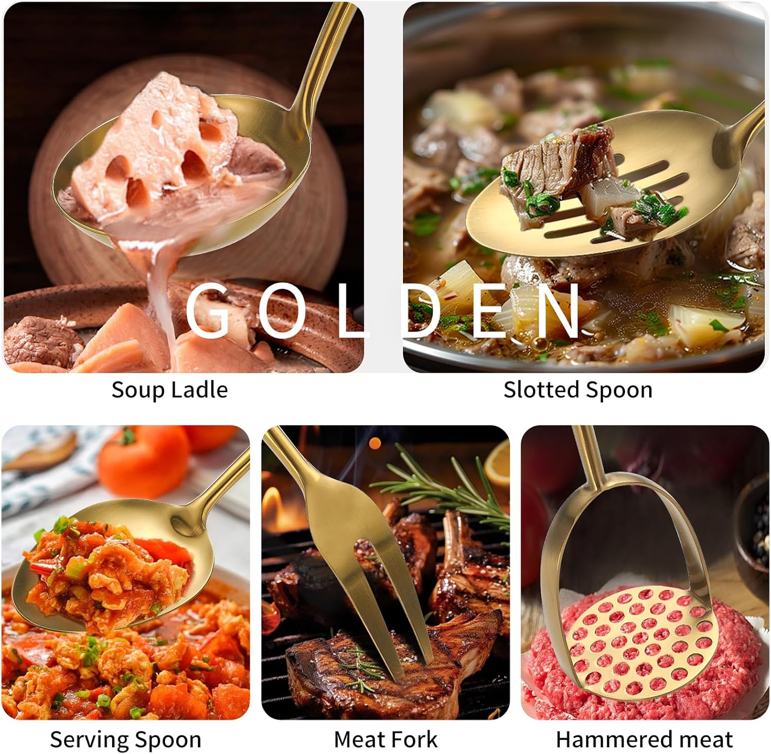 304 Stainlss Steel Matte Kitchen Utensils Set, 12 Pcs Long Metal Cooking Utensil Gadgets Tools Set with Spatula, Ladle, Spoon, Ladle, Skimmer, Tunner, Pasta Server, Tongs(Gold, Dishwasher Safe)