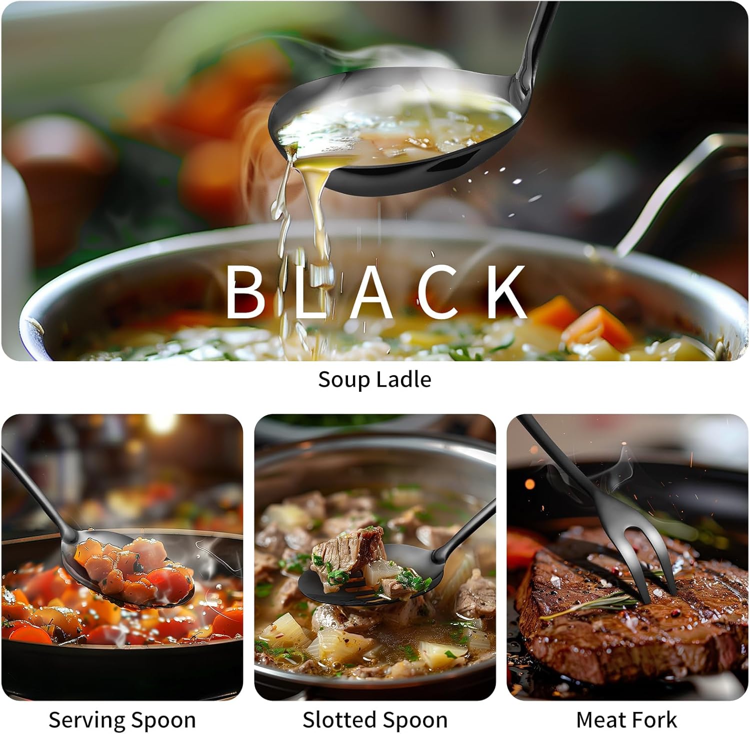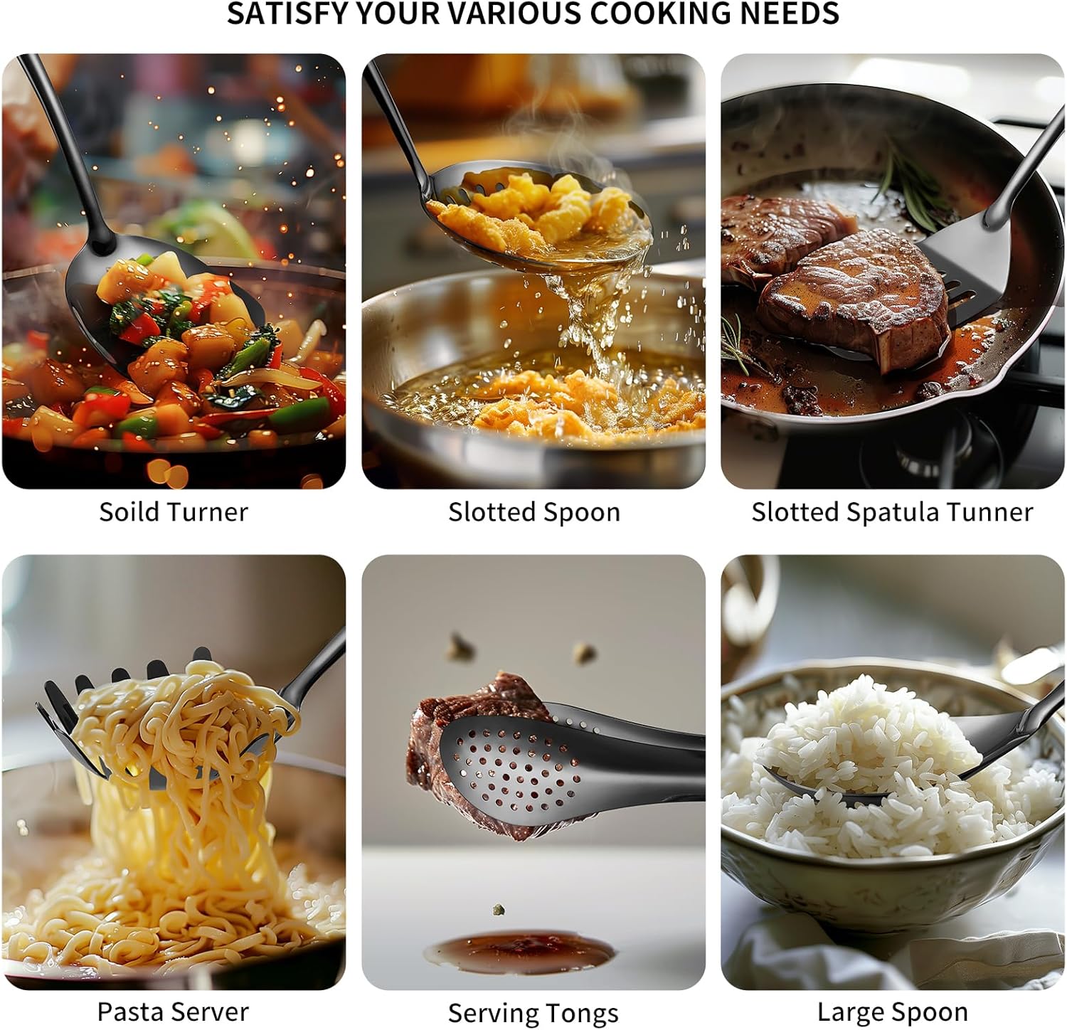 • 11 Pieces Kitchen Utensils Set: Lazycorner Utensils Serving Set consists of 1 Solid Turner, 1 Soup Ladle, 1 Slotted Spoon, 1 Slotted Spatula Turner, 1 Large Spoon, 1 Spaghetti Spoon, 1 Serving Spoon, 1 Meat Fork, 1 Skimmer Spoon, 2 Serving Tongs