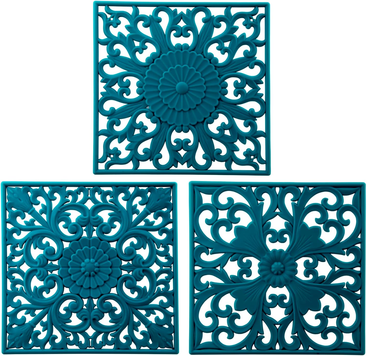 • DECORATIVE HOME AND KITCHEN - 7.09*7.09*0.2 inch teal silicone trivet mats set has 3 carving-shaped designs to decor your home, kitchen decor for counter. Great for granite and quartz countertops, kitchen counter, wood kitchen and dining tables. Practical and useful hot mats for kitchen, countertop, table but also work great to enhances the decor to your dinner room. Sufficient quantity allows you to use and replace for daily life.
